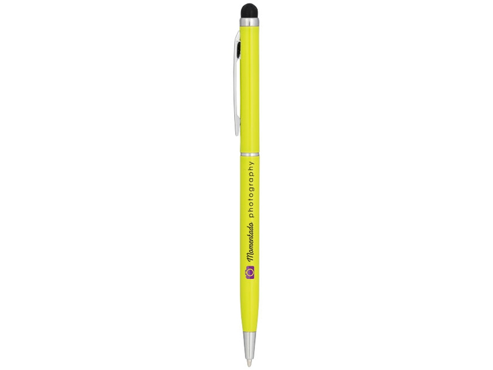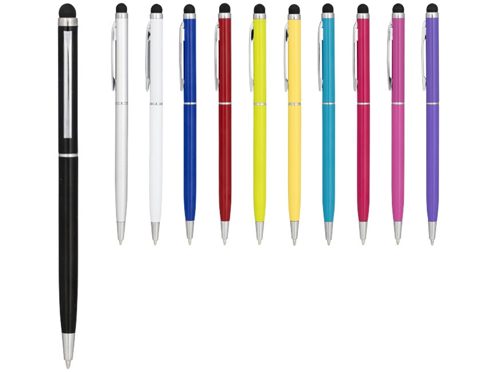 Алюминиевая шариковая ручка Joyce. Тонкая алюминиевая шариковая ручка с поворотным механизмом и стилусом. Алюминиевый корпус с металлическим зажимом и кольцом посередине, остальные элементы из пластика.