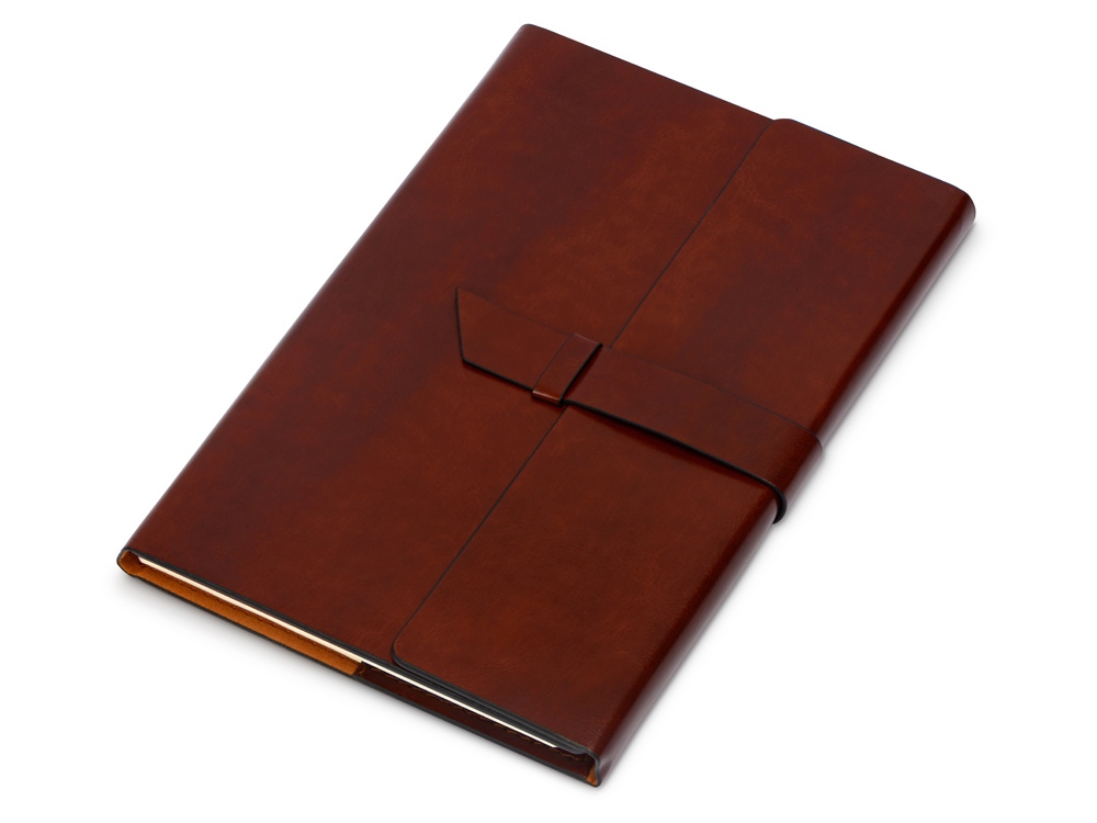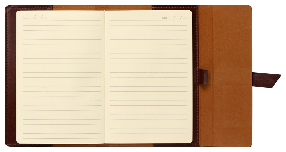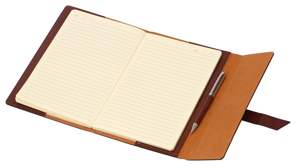 Бизнес-блокнот формата А5 в твердой обложке из искусственной кожи станет отличным подарком для любого клиента. Блокнот состоит из обложки с клапаном и сменного блока с линованными страницами. Внутри обложки есть петля для ручки в тон (ручка в комплект не входит).