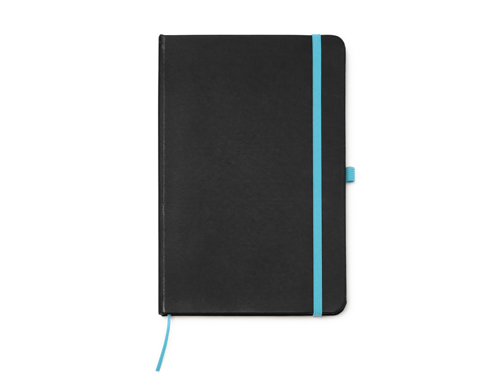 Блокнот формата А5 в твердой обложке из черного полиуретана. Цветная закладка, резинка и держатель для ручки. 80 листов в линейку.