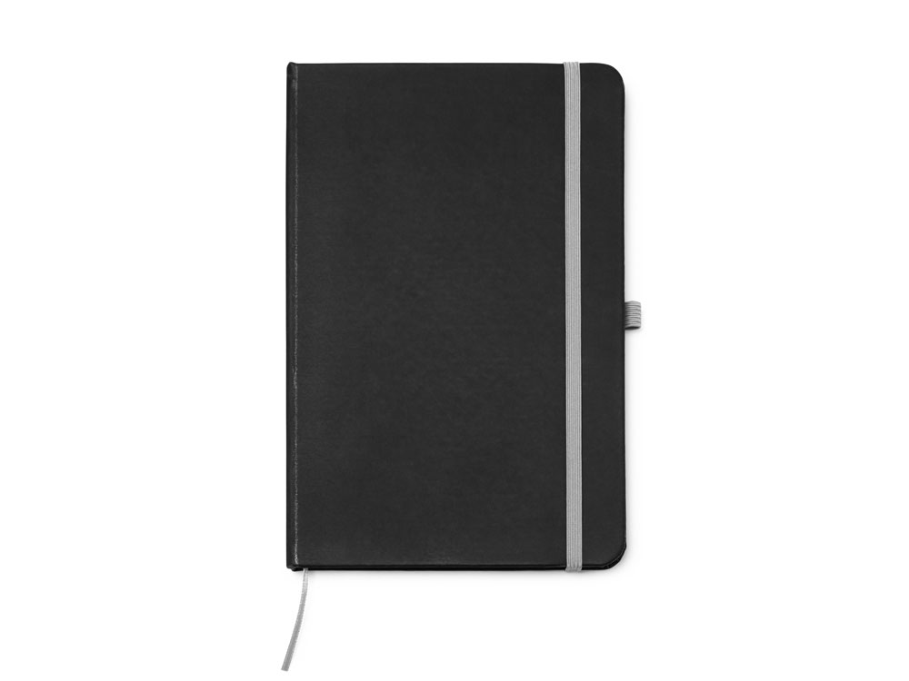 Блокнот формата А5 в твердой обложке из черного полиуретана. Цветная закладка, резинка и держатель для ручки. 80 листов в линейку.