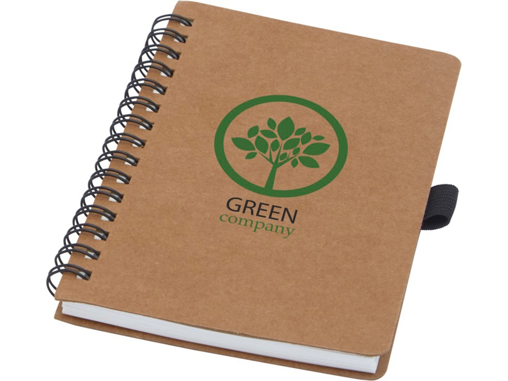 Блокнот на пружине формата A5, изготовленный из переработанного картона, с петлей для ручки. Содержит 70 листов в линию плотностью 60 г/м², изготовленных из каменной бумаги. В производстве каменной бумаги не используется дерево, а на сам процесс изготовления затрачивается гораздо меньше энергии в сравнении с производством переработанной или целлюлозной бумаги. Бумага водонепроницаемая и стойкая на разрыв. Имеет естественный белый цвет (без отбеливания).