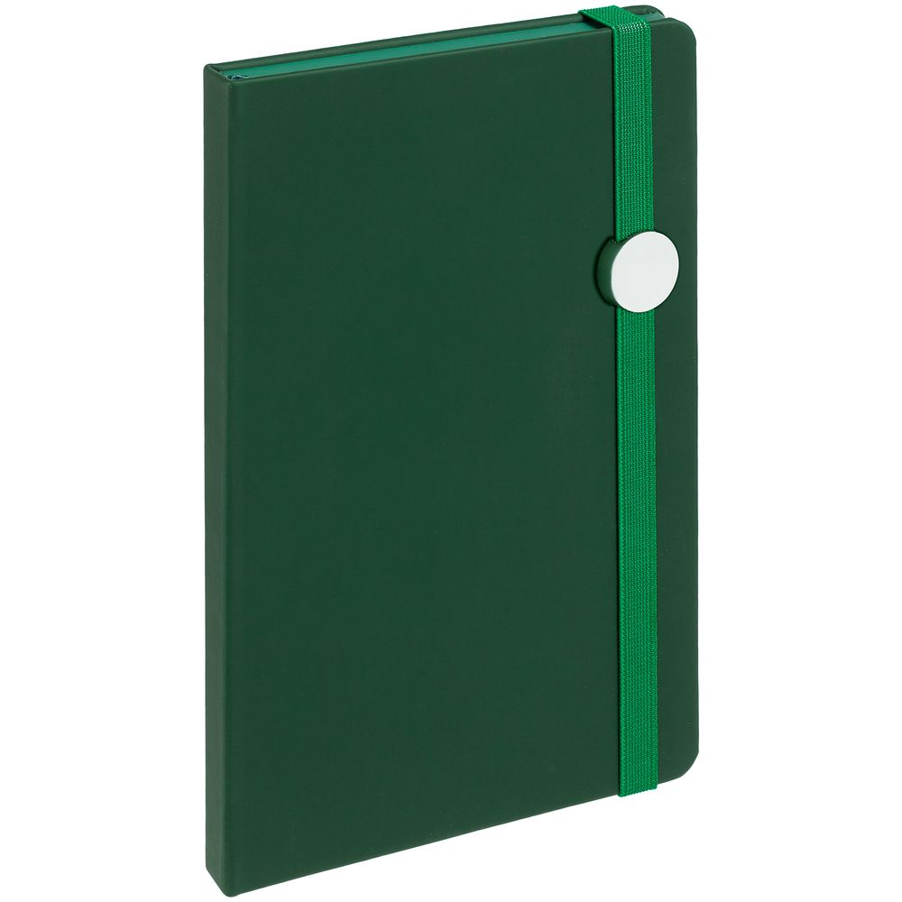 Блокнот в твердой обложке, выполнен из материала Soft Touch, зеленый FF, дополнен резинкой и ляссе в цвет обложки.