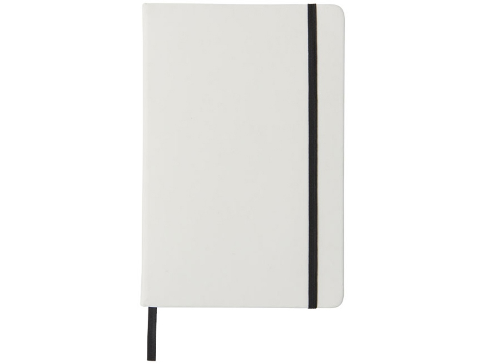 Белый блокнот A5 с цветной эластичной закладкой и резинкой. 96 страниц (60g/m2), линованная бумага. На обложке возможна цифровая печать.
