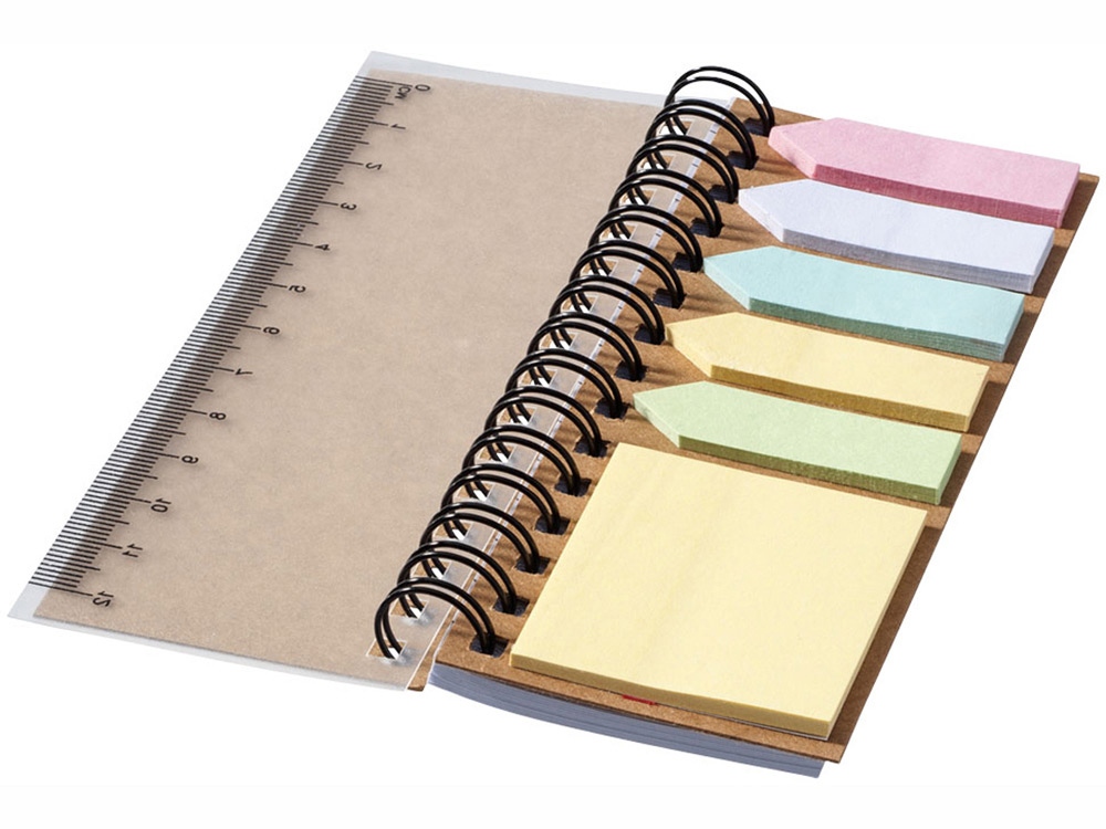 Блокнот Spiral с клейкими листами. Блокнот с 25 страницами клейких листочков 5 цветов и 40 страницами линованной белой бумаги. Включает линейку на передней обложке. ПП-пластик.
