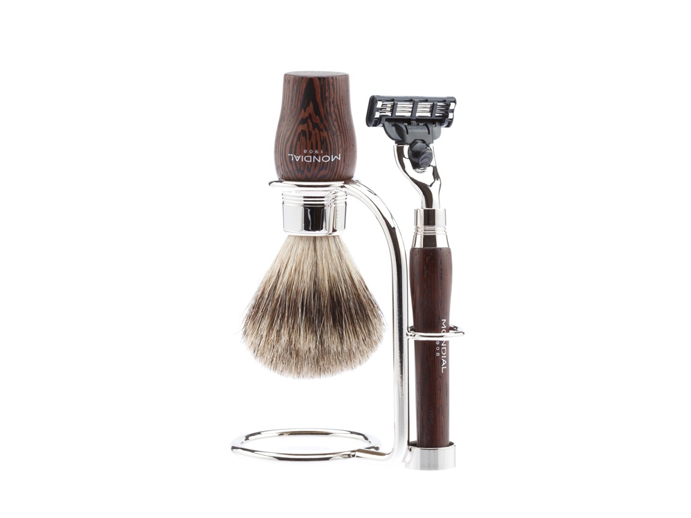 Ассортимент бритвенных аксессуаров MONDIAL является эталоном для всех видов бритья. Только лучшие материалы обретают форму в опытных руках итальянских мастеров. Бритвенный набор из лимитированной коллекции MONDIAL разработан лучшими итальянскими дизайнерами. В наборе идеально сочетаются искусно обработанная древесина венге и великолепный ворс барсука. Минималистичный, но элегантный дизайн бритвенного набора – уникальный в своем роде современный элемент роскоши, это возможность выйти за рамки моды для создания аутентичного итальянского стиля вне времени. Бритвенный набор MONDIAL • бритвенный станок, совместимый с кассетами Gillette MACH3 (одна кассета в комплекте); • помазок с барсучьим ворсом категории Best Badger, диаметр узла - 20 мм (размер M); • подставка из никелированной латуни Помазок Тип ворса: Натуральный барсучий ворс категории Best Badger Диаметр узла: 20 мм (размер M) Материал рукояти: дерево Венге, никелированная латунь Размеры: высота помазка - 118 мм, высота рукояти - 60 мм, диаметр основания - 32 мм Вес: 80 гр. Станок Тип лезвия: Gillette MACH3 Материал рукояти: дерево Венге, никелированная латунь Размеры: высота станка с лезвием - 137 мм Вес: 35 гр. Подставка подставка для бритвенного станка и помазка изготовлена из никелированной латуни