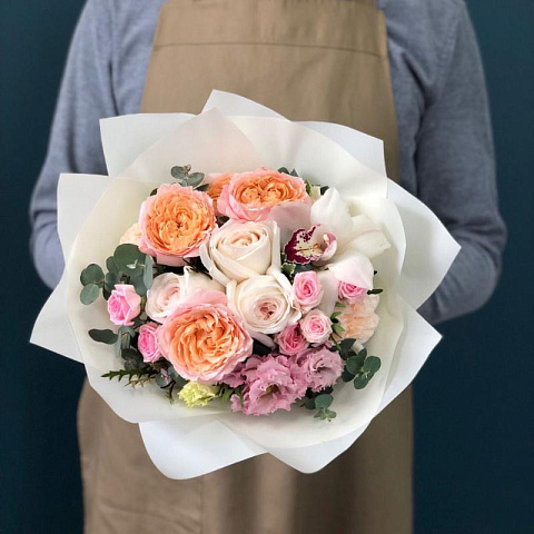 | Состав | кустовая пионовидная роза, роза, кустовая роза, эустома, гвоздика, орхидея, эвкалипт. |