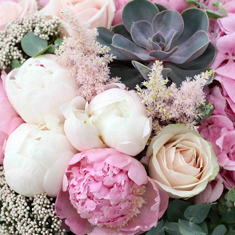 | пионы, гортензия, суккулент, астильба, розы, озотамнус, эвкалипт; | |