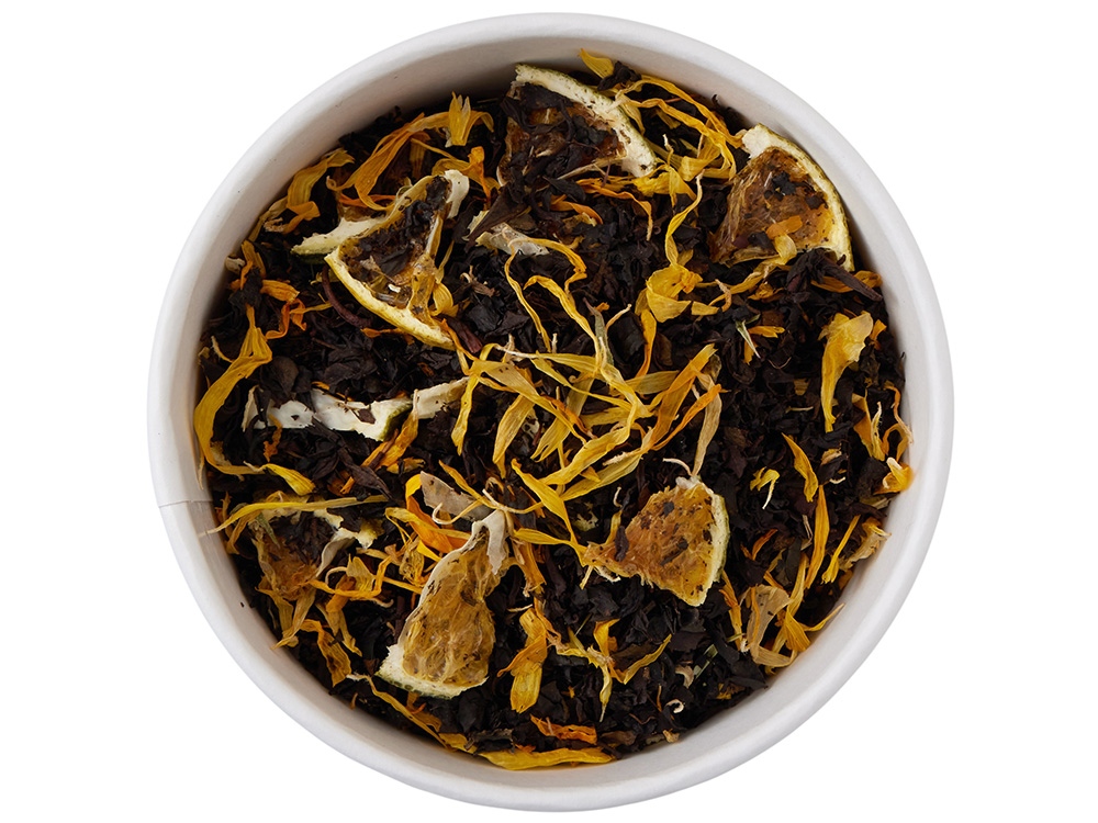 | Состав | черный чай, лепестки календулы, слайсы мандарина, ароматизатор натуральный Глинтвейн, ароматизатор натуральный Мандарин |