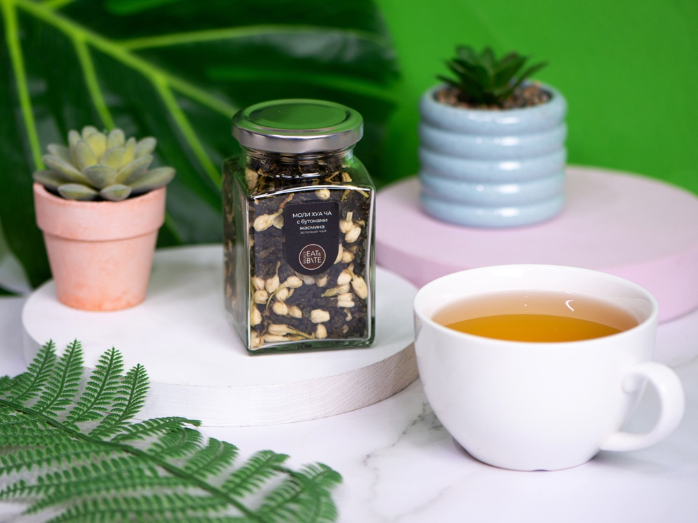 Чай зеленый Моли Хуа с бутонами жасмина, серия Bouquet Для тех, кто хочет добавить в чаепитие новых красок, придумана серия Bouquet. Каждый купаж чая в серии имеет разнообразные и неожиданные добавки фруктов, ягод или трав. Китайский зелёный чай Тегуаньинь славится своей способностью успокаивать и прояснять сознание, - то, что нужно для холодных зимних вечеров. Бутоны жасмина придадут напитку свой уникальный аромат и вкус. - вес чая: 65 гр.; - состав: китайский чай Тегуаньинь, бутоны жасмина, натуральный ароматизатор; - стеклянная банка сохраняет все ароматы чая.