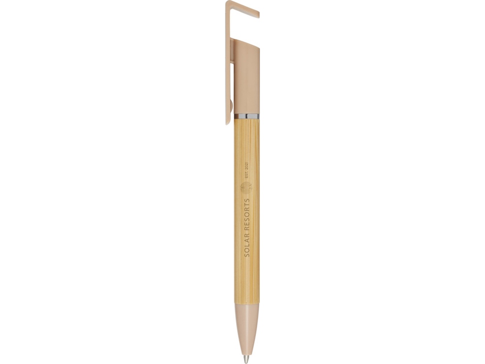 Бамбуковая шариковая ручка, которая также может служить подставкой для телефона. Кнопка и среднее кольцо изготовлены из переработанного пластика, наконечник — из латуни, а корпус — из бамбука, полученного из ответственных источников. Цвет чернил: синий. Длина непрерывной линии: 1000 метров. Размер пера: 1,0 мм. FSC certified bamboo. FSC Mix Credit N5 CU-COC-877277.