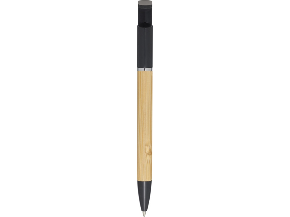 Бамбуковая шариковая ручка, которая также может служить подставкой для телефона. Кнопка и среднее кольцо изготовлены из переработанного пластика, наконечник — из латуни, а корпус — из бамбука, полученного из ответственных источников. Цвет чернил: черный. Длина непрерывной линии: 1000 метров. Размер пера: 1,0 мм. FSC certified bamboo. FSC Mix Credit N5 CU-COC-877277.