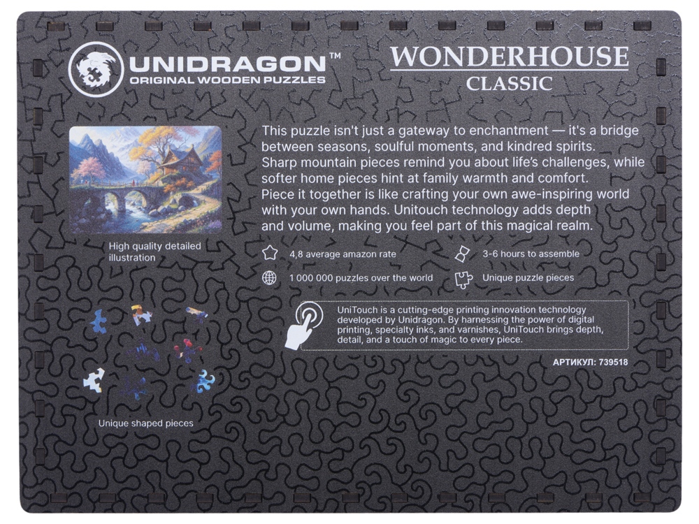 Уникальные фигурные детали этого пазла похожи на извилистые горные тропы. Это — полный откровений лабиринт, в котором два странника ищут путь к себе. Мягкий черно-белый туман расступается перед ними, чтобы показать вершину храма, как воплощение далекой мечты. Там они найдут совершенное спокойствие и умиротворение. У пазла уникальный — гипнотический — рез. Детали меняются от жестких геометричных, до мягких и извилистых, чтобы в конце концов сойтись к храму в центре картины воронкой, в которой исчезнут все ваши тревоги и заботы. Атмосферная черно-белая иллюстрация позволит с головой погрузиться в сборку. А фирменная технология печати Unitouch дарит ей глубину и объем, который оживет под вашими пальцами. Этот пазл — вдохновение, которое укроет вас от суеты и погрузит в мир, где время замирает. - Количество деталей: 500шт. - Размер собранного пазла: 42х29,7см - Длительность сборки: от 6 часов - Детали уникальной формы - Прочные и долговечные детали с безупречным сцеплением - Премиальная подарочная коробка из дерева, которую можно персонализировать