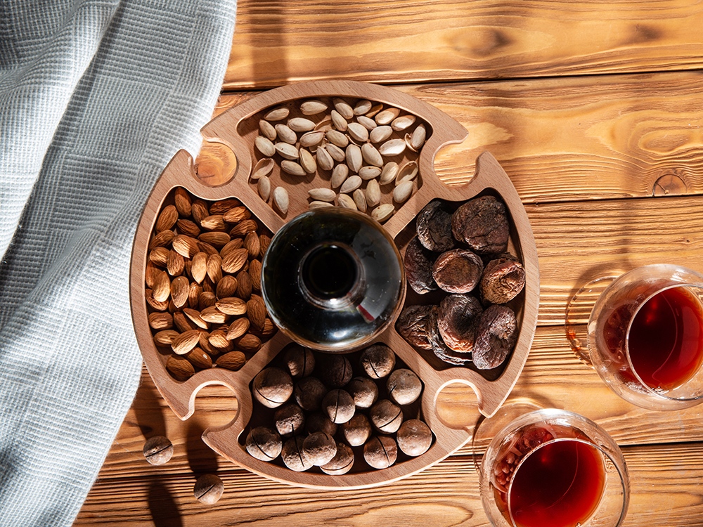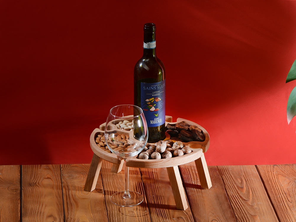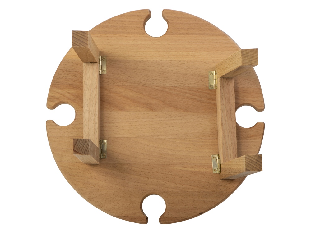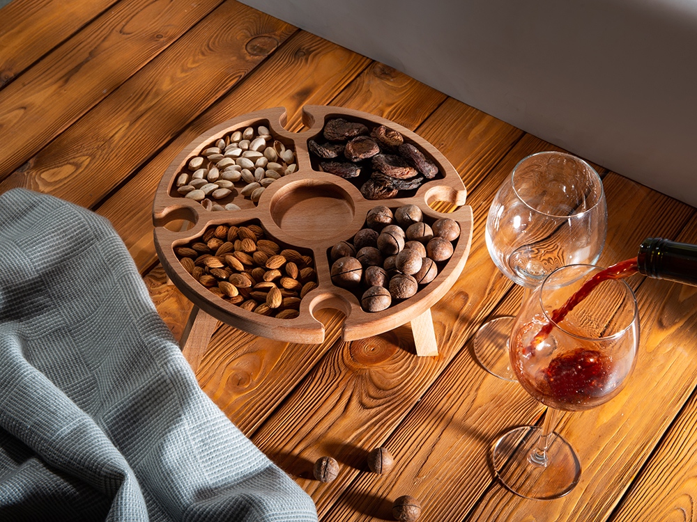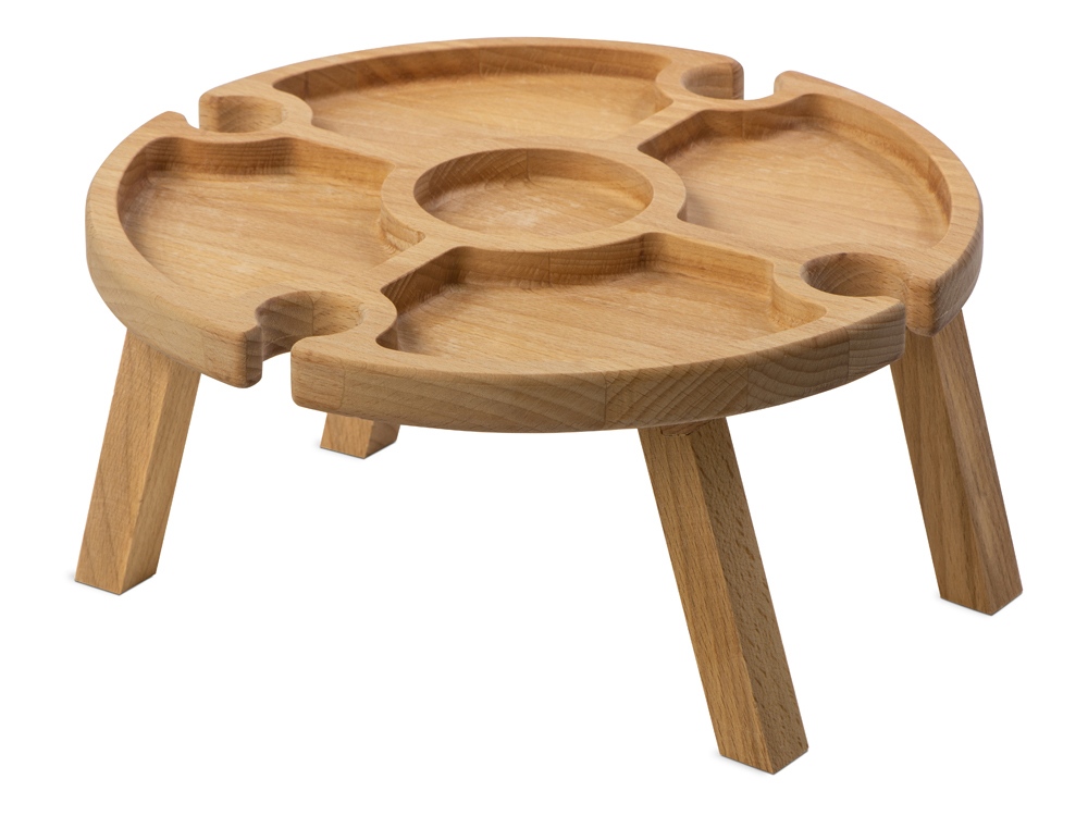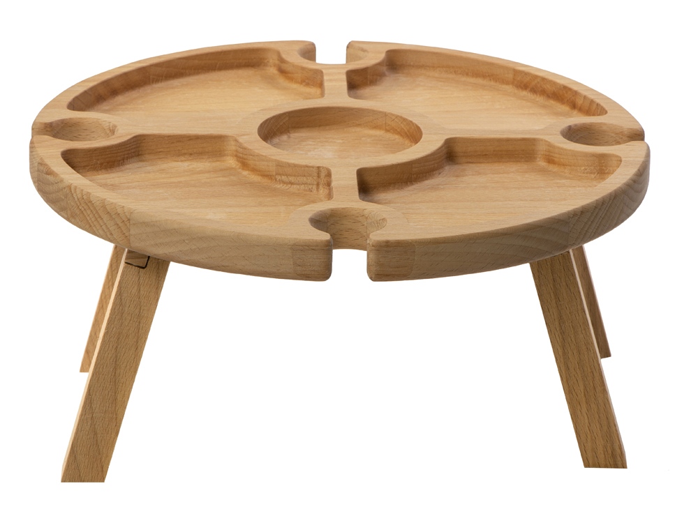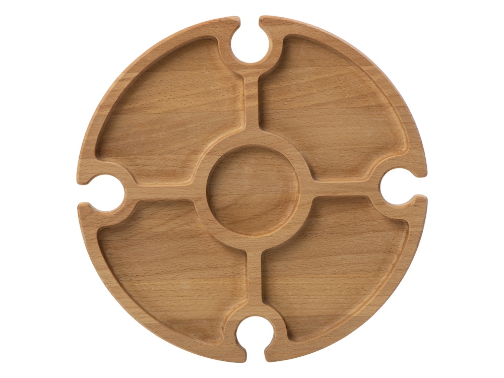 Деревянный столик на складных ножках может быть использован как во время пикников на открытом воздухе, так и дома, где его можно использовать прямо на полу. Столик позволяет подать 4 вида различных закусок, не смешивая их, благодаря четырем сепарированным секциям, в которые можно поместить ягоды, орехи и другие снеки, желательно, сухие либо подающиеся в масле (оливки, маслины). Четыре держателя для бокала особенно актуальны во время отдыха на природе, где каждый участник пикника обязательно оценит возможность зафиксировать посуду для вина. Помимо функциональности столика не можем не отметить и его эстетичность, которая позволяет изящно преподнести вино и снеки к нему. - 4 вместительных отделения для закусок - 4 держателя для бокалов - натуральный бук, обработанный минеральным пищевым маслом - удобные складные ножки - для приятных вечеров на природе и дома Натуральный бук, из которого выполнен столик, как и любое дерево, требует ухода, который существенно продлит ему жизнь и позволит радовать своего обладателя в течение многих лет. Пропитывание пищевым маслом (растительное, льняное и т.д.) раз в один-два месяца поможет сохранять свежий вид изделия. Рекомендации по использованию: - не рекомендуется использовать в посудомоечной машине, микроволновой печи, замачивать в раковине с водой - не использовать агрессивные моющие средства - использовать мягкую губку для очищения - вытирать насухо после мытья - транспортировать изделия при температурном режиме от +5°C до +20°C - хранить в помещениях с влажностью до 65-70% - не подвергать прямым солнечным лучам - не подвергать нагреву - хранить при температуре от +5°C до +20°C - не оставлять на морозе от -10°C на более чем 6 часов