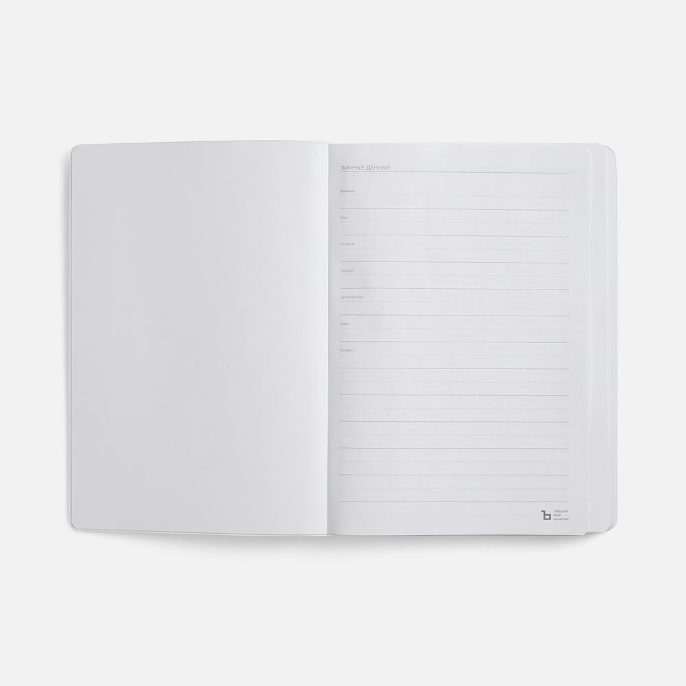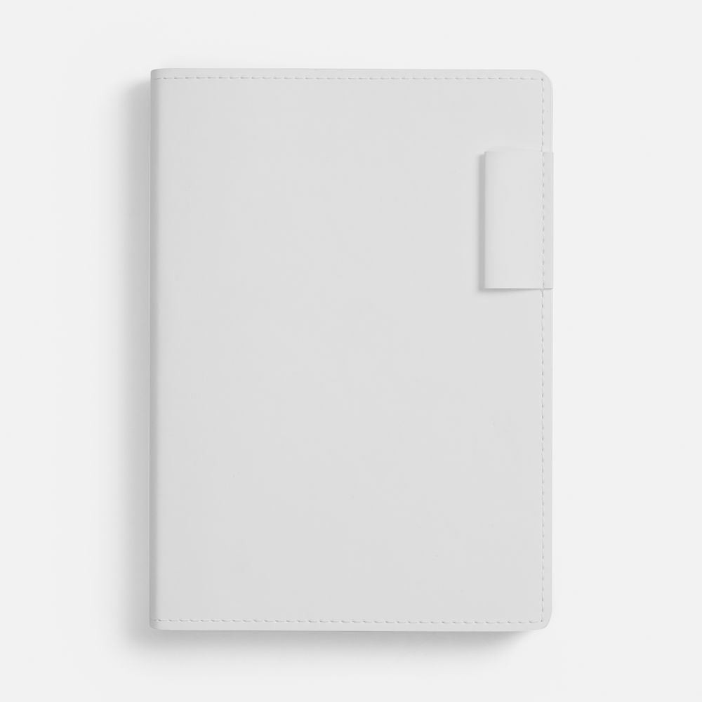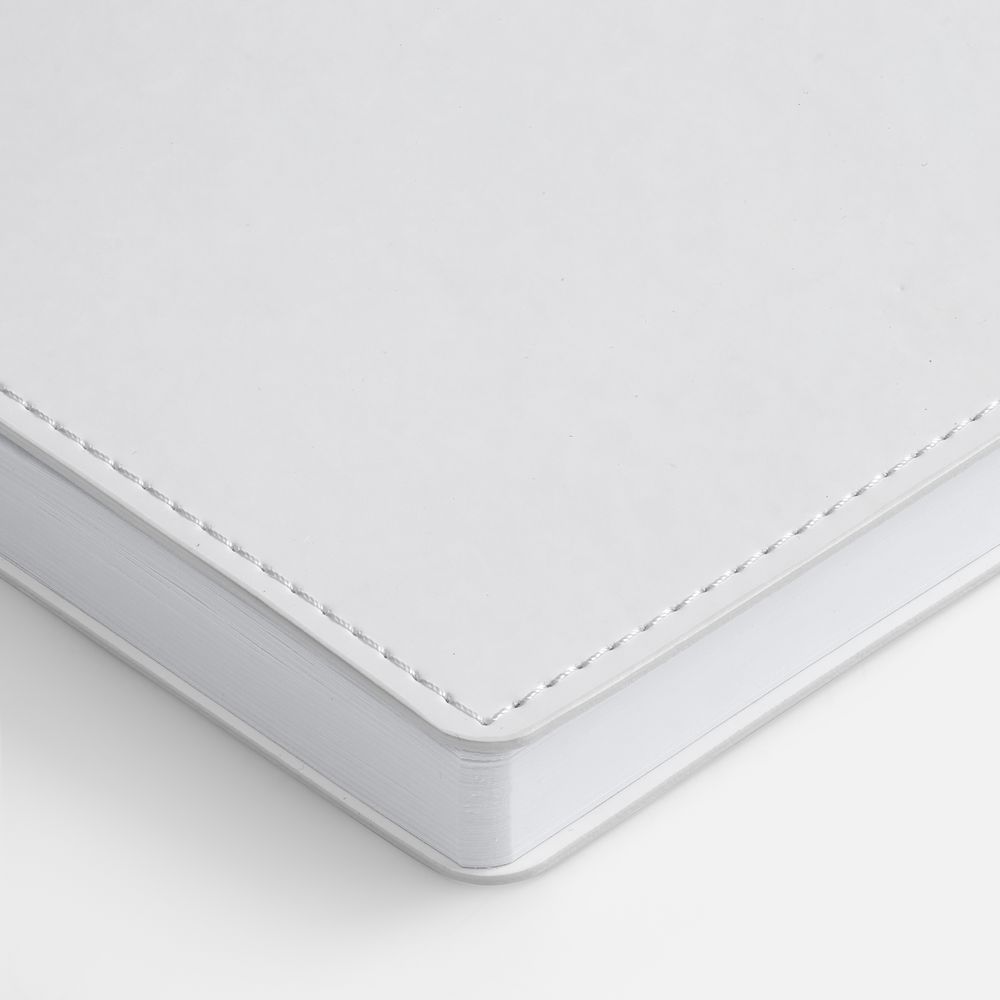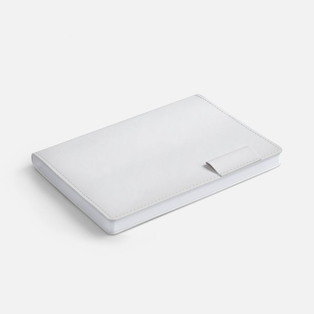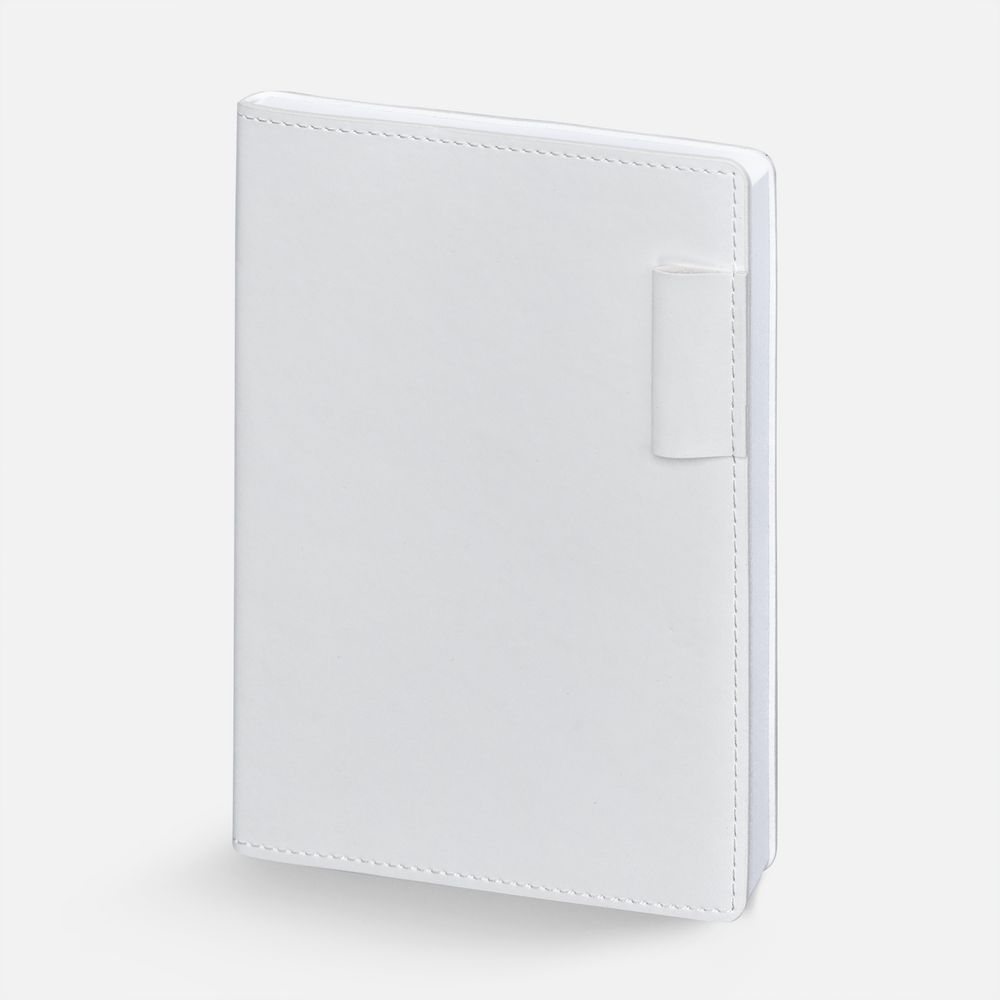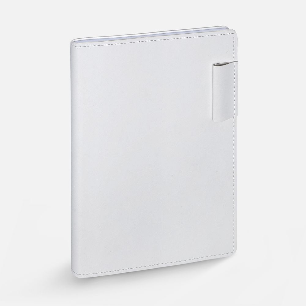 Ежедневник с гибкой обложкой из материала Soft Touch, белый BB, дополнен петелькой для ручки из покровного материала, капталом, ляссе и закрашенным срезом обложки в цвет материала.