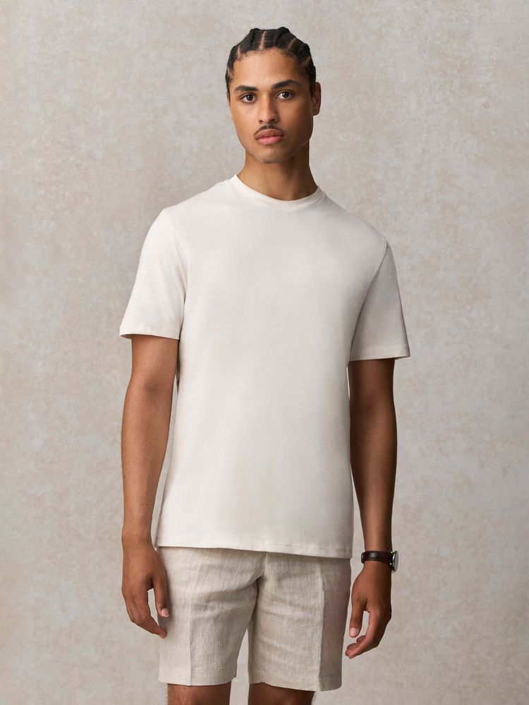За счет идеальных пропорций гребенного хлопка и переработанного полиэстерав составе, а также благодаря дополнительным обработкам полотно обладает повышенной мягкостью, шелковистостью и очень приятно на ощупь. Кроме того футболка меньше мнется, не теряет форму после стирок и обладает высоким показателем Qmax — коэффициента мгновенной теплопроводности, который показывает, как быстро ткань забирает тепло от кожи. Именно он обеспечивает ощутимый эффект свежести и прохлады при первом прикосновении к ткани.