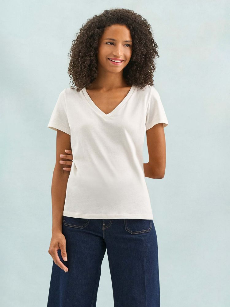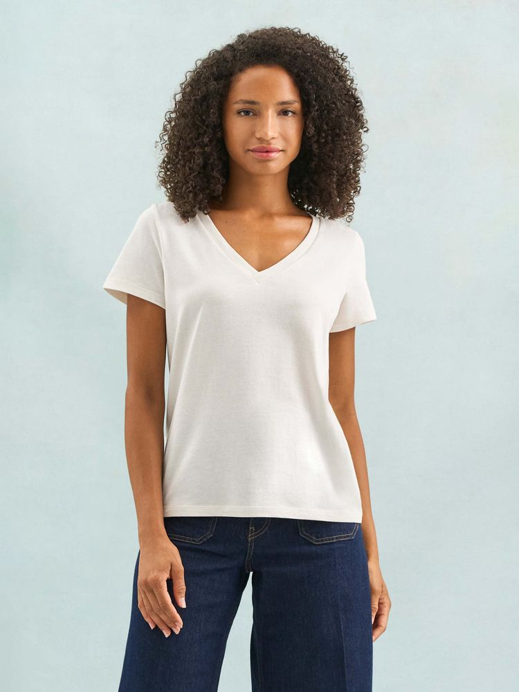 Женская футболка Regent с V-образным вырезом. Такой вырез снова актуален: он визуально удлиняет шею, подчеркивает линию ключиц и добавляет образу легкости.