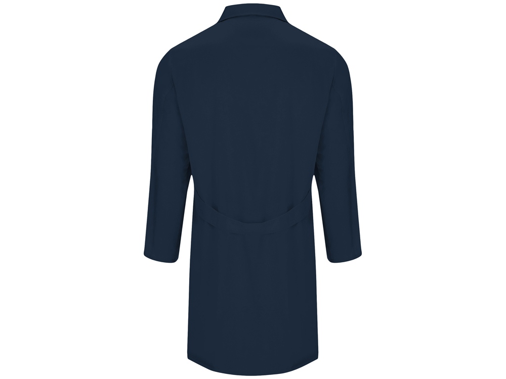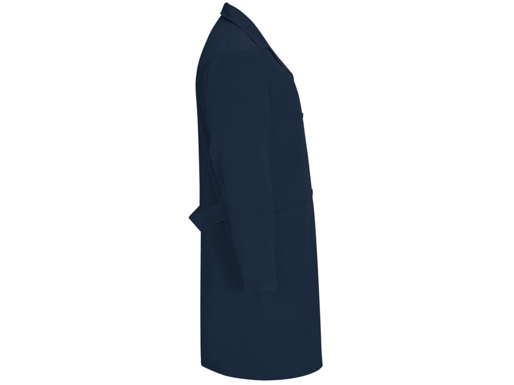 Халат для персонала с длинными рукавами. · Воротник с лацканами. · Центральная застежка на 5 пуговиц в тон. · Один нагрудный карман и два кармана по бокам. · Пояс сзади.