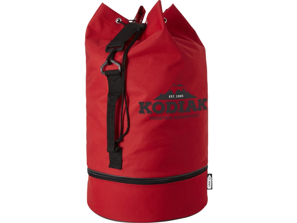 Водонепроницаемый спортивный вещмешок из переработанного РЕТ-пластика с вместительным 20 основным отделением объемом 20 литров, застежкой на шнурке, боковой ручкой и регулируемым плечевым ремнем. Также имеет отдельное нижнее отделение на молнии для небольших предметов.