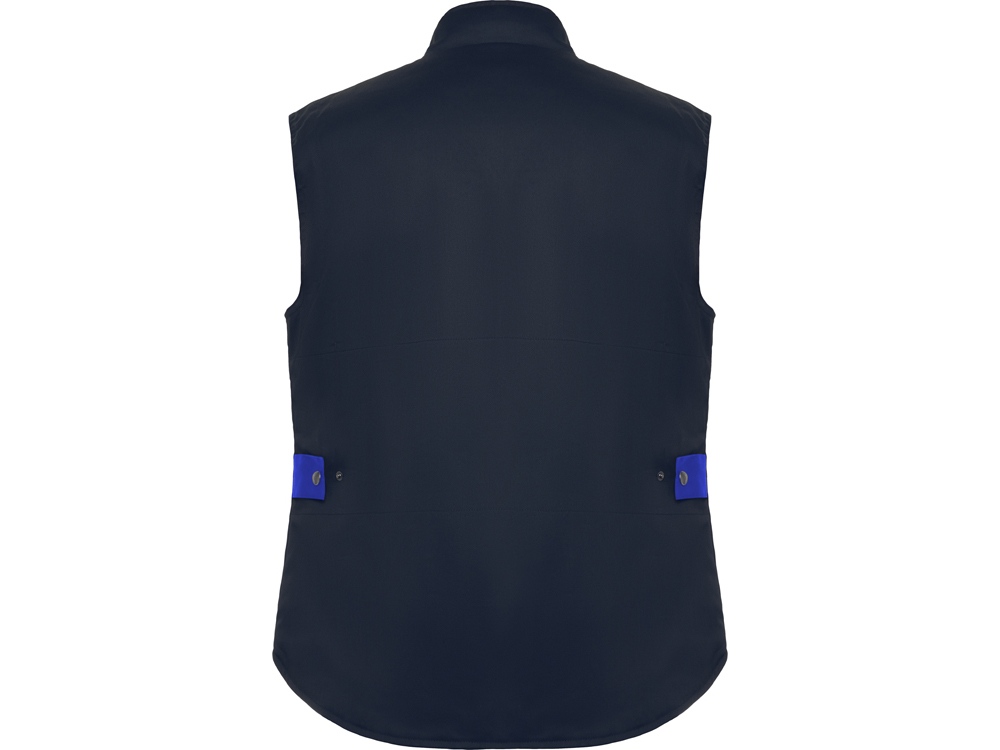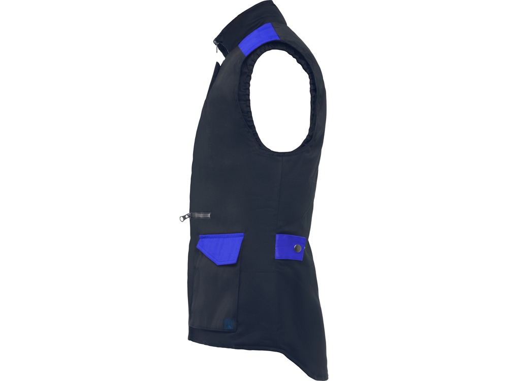 Рабочий жилет в двухцветной комбинации с несколькими карманами и высоким воротником. · Центральная молния с планкой на липучках · Правый наружный карман для мобильного телефона с клапаном и липучкой. · Два передних кармана со складками и клапанами застегиваются липучками. · Два кармана для ручек. · Внутренний карман с застежкой-липучкой. · Карман на застежке-молнии. · Закругленный низ. · Автоматический регулятор. · Контрастные плечевые части и детали.