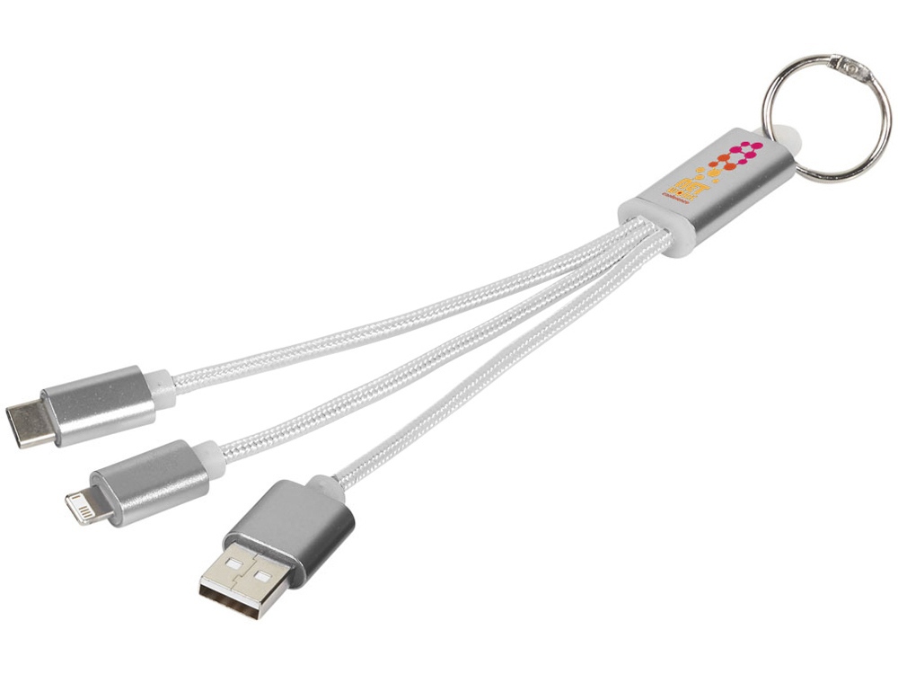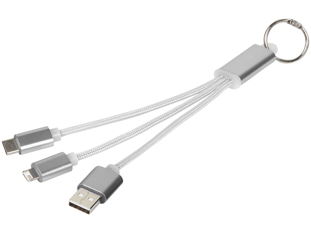 Кабель для зарядки Metal 3-в-1 с брелоком, коннекторами 1 type с, 1 USB type A и двойным совместимым коннектором 2-в-1 для устройств с ОС Apple® iOS и Android. В комплект входит брелок. Для зарядки устройств Apple подключайте кабель стороной без контактов; для зарядки устройств с ОС Android подключайте кабель стороной с контактами. Алюминий.