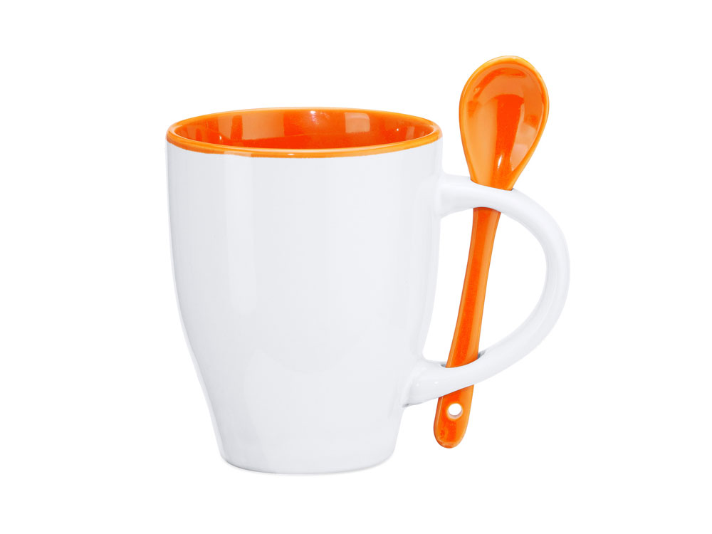 Керамическая кружка емкостью 350 мл. Цветная внутренняя часть и ложка в тон. Продукт подходит для использования в микроволновой печи и посудомоечной машине.