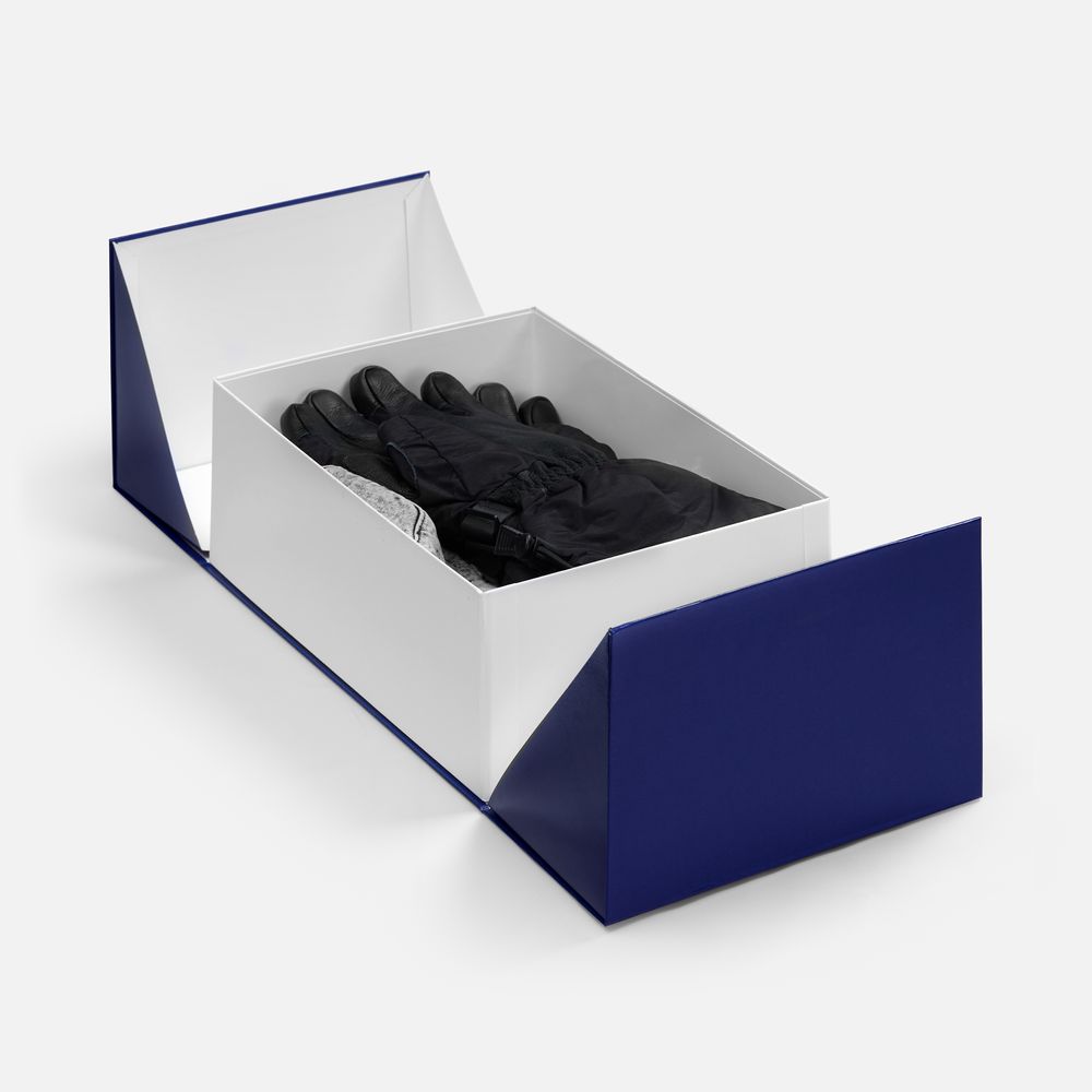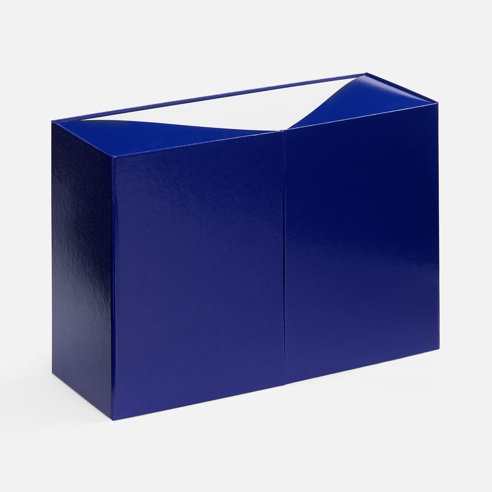 Коробка из переплетного картона 2 мм с оригинальной конструкцией: две симметричные створки открываются, создавая эффектную презентацию содержимого. Складная система на предустановленный двусторонний скотч делает сборку коробки быстрой и интуитивно понятной.