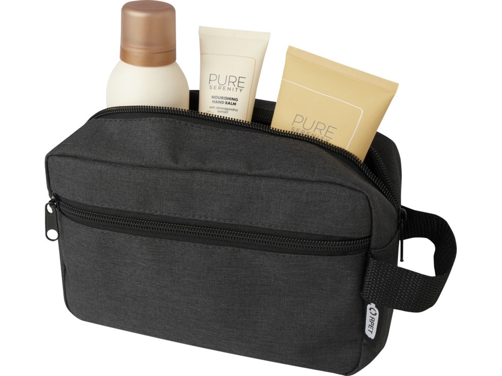 Косметичка Ross — идеальный спутник для путешествий для ношения предметов гигиены и косметики. Изготовлена из переработанного полиэстера, сертифицированного согласно GRS, что делает ее более экологичным выбором. Имеет основное отделение на молнии, передний карман и плетенную петлю. Емкость: 1,5 литр. 300DGRS certified recycled polyester.