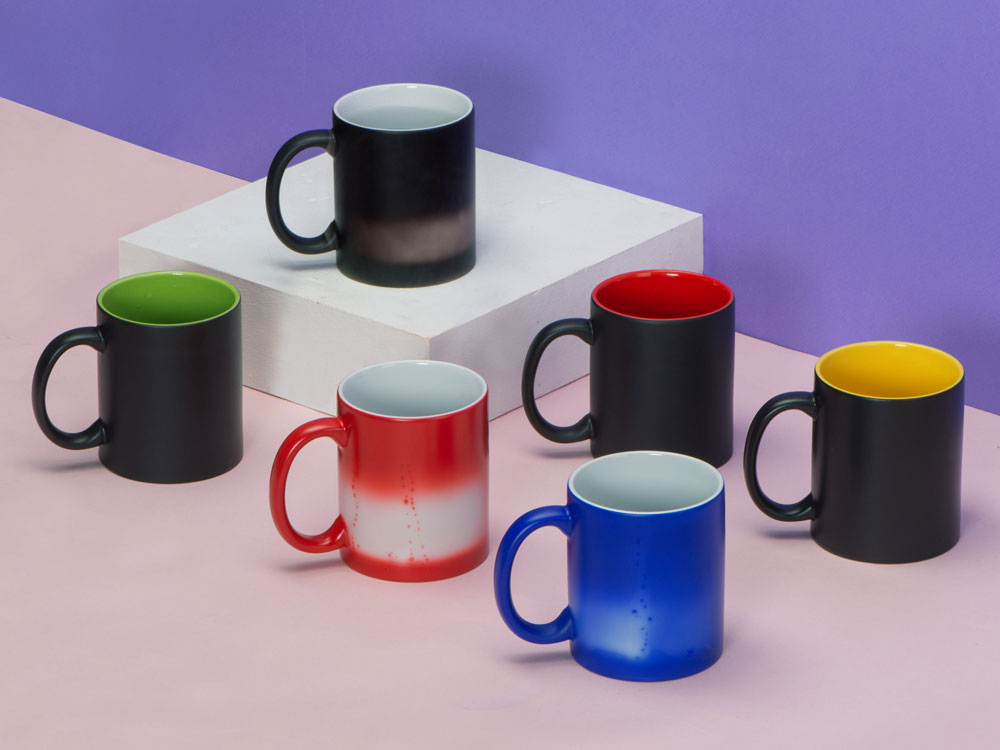 Кружка-хамелеон меняет свой облик, едва вы нальете в нее горячий напиток: черная поверхность постепенно изменяет свой цвет, становясь белой. Внутренняя часть кружки — яркая, цветная, что можно красиво обыграть, удачно сочетая ее с цветом вашего лого или гаммой изображения. Кружки-хамелеоны не рекомендуется мыть в посудомоечной машине, жесткими средствами и губками, которые могут нарушить слой пленки-хамелеона, кроме того, ее нельзя использовать в микроволновой печи.