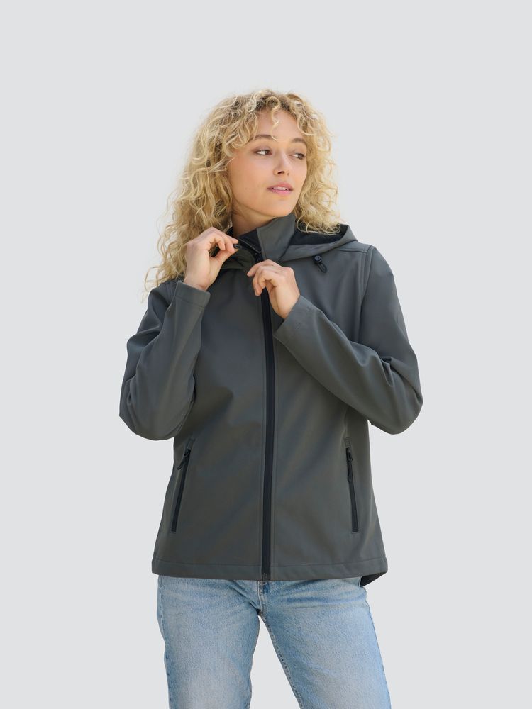 Куртка софтшелл с капюшоном женская Race Women, темно-серая купить оптом и в розницу с нанесением логотипа в Москве