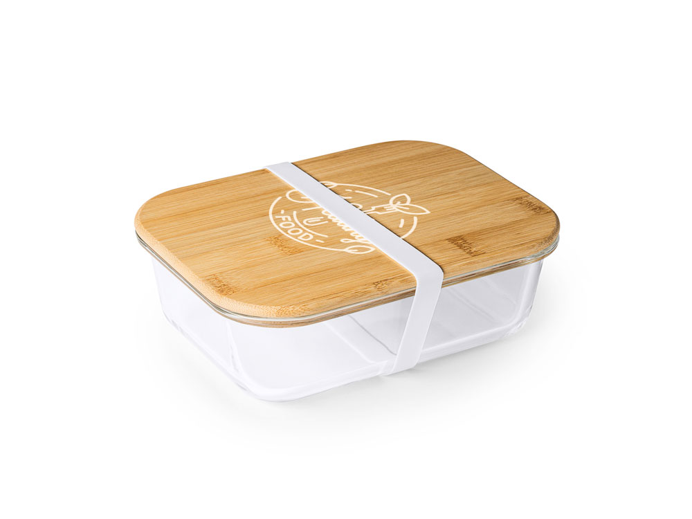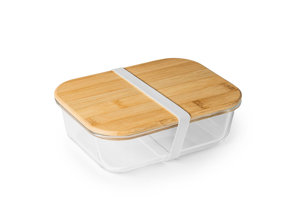 Ланч-бокс из боросиликатного стекла с бамбуковой крышкой и силиконовой лентой для закрытия.