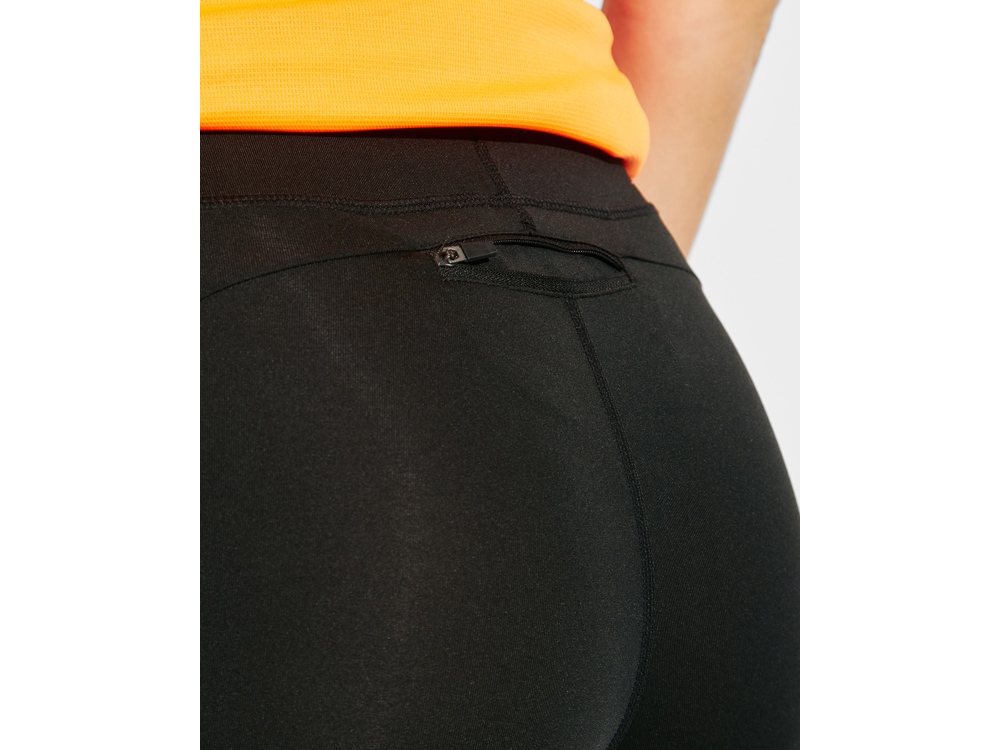 Женские спортивные легинсы длиной три четверти. Эластичный пояс с внутренним шнурком для регулировки. Светоотражающие детали. Карман сзади на молнии.