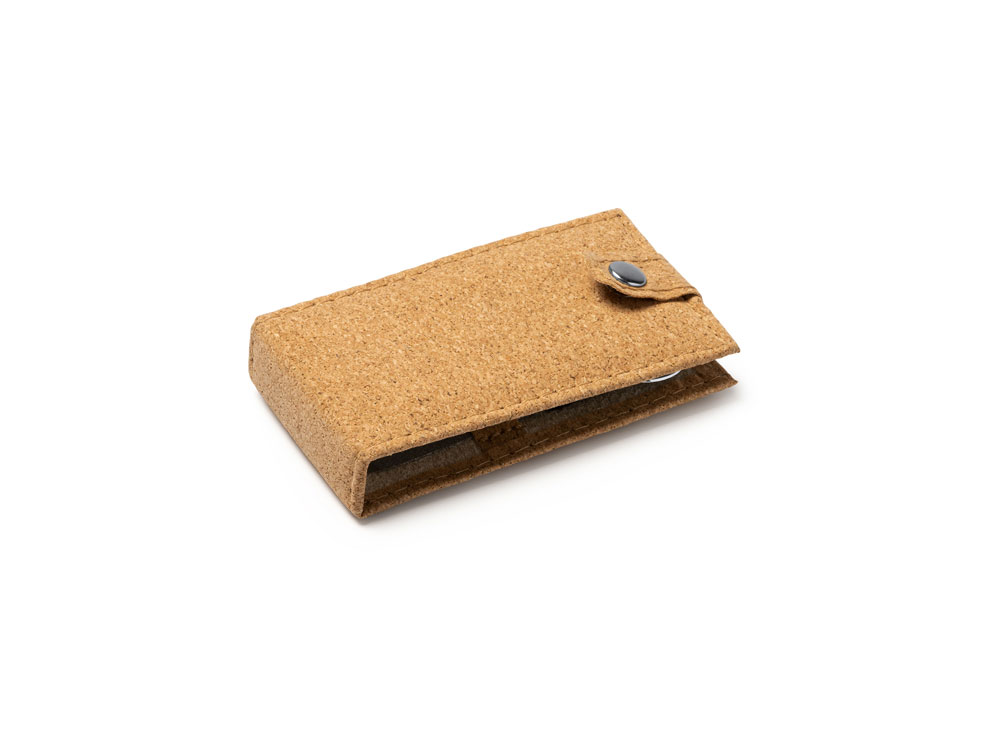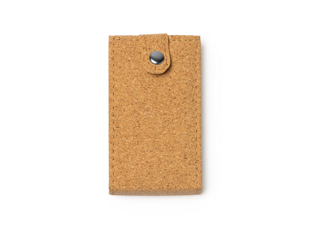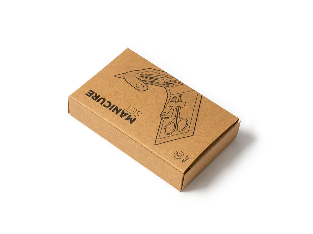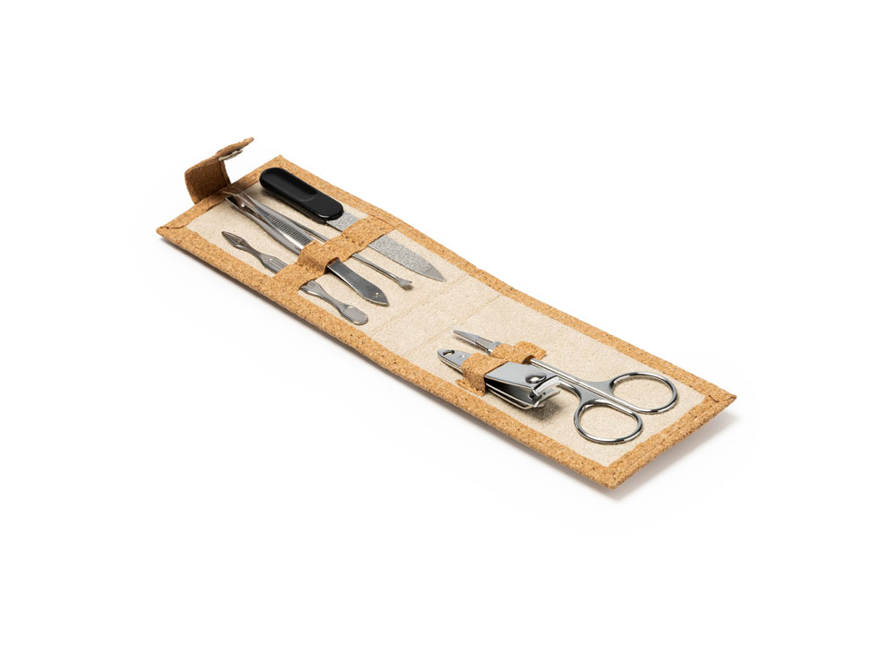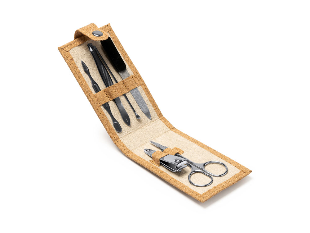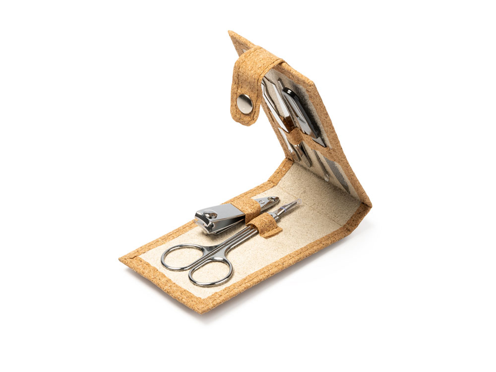 Маникюрный набор в чехле из пробки с застежкой на кнопу. Включает ножницы, пинцет, кусачки для ногтей, пилку и средство для удаления кутикулы из нержавеющей стали.