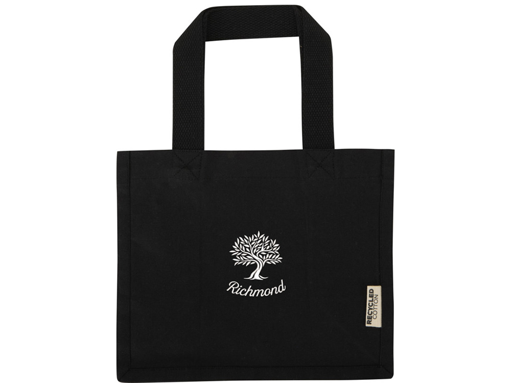 Мини эко-сумка Odessa с клинчиком, изготовленная из переработанного хлопка, сертифицированного согласно GRS, плотностью 220 г/м², объемом 9 л - сплошной черный купить оптом и в розницу с нанесением логотипа в Москве