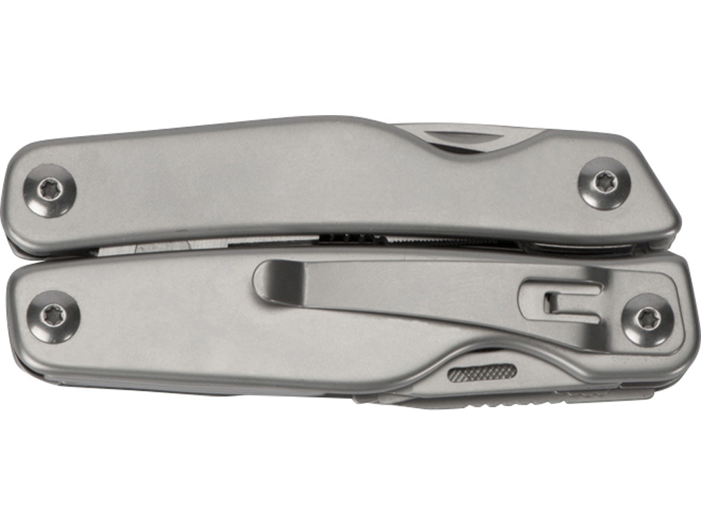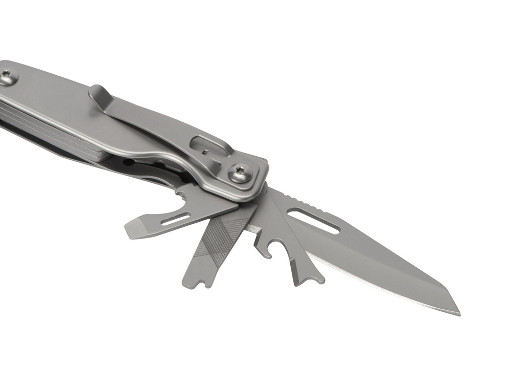 Мультитул-пассатижи Combo бренда roq выполнен из нержавеющей стали. Матовое покрытие позволяет сделать брендирование более заметным. Чтобы не потерять инструмент, его можно прикрепить клипом за ремень или подвесить за складное кольцо. Поставляется в индивидуальной коробке вместе с чехлом. • матовая текстура — фон для яркого нанесения • чехол в комплекте • пассатижи и другие важные инструменты помогут и в повседневной жизни, и в походе Функции: 1. Пассатижи 2. Нож 3. Консервный нож 4. Напильники по металлу и дереву\пилка для ногтей 5. Плоская отвертка 6. Открывашка для бутылок 7. Нож для писем 8. Складное кольцо для крепления 9. Крестовая отвертка 10. Пила