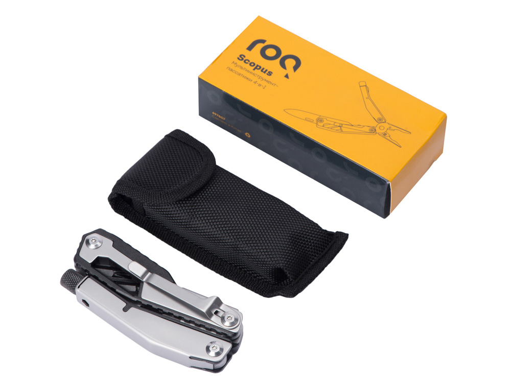 Складной нож Scopus от roq выполнен в ассиметричном необычном дизайне, в его составе — среднего размера нож, пассатижи, плоская и крестовая отвертки (биты), шестигранный ключ 5 мм. Брендированный чехол в комплекте. • легко открывается и закрывается • фиксатор на упоре • клипса для ношения на поясе • компактный • нержавеющая сталь 420 марки