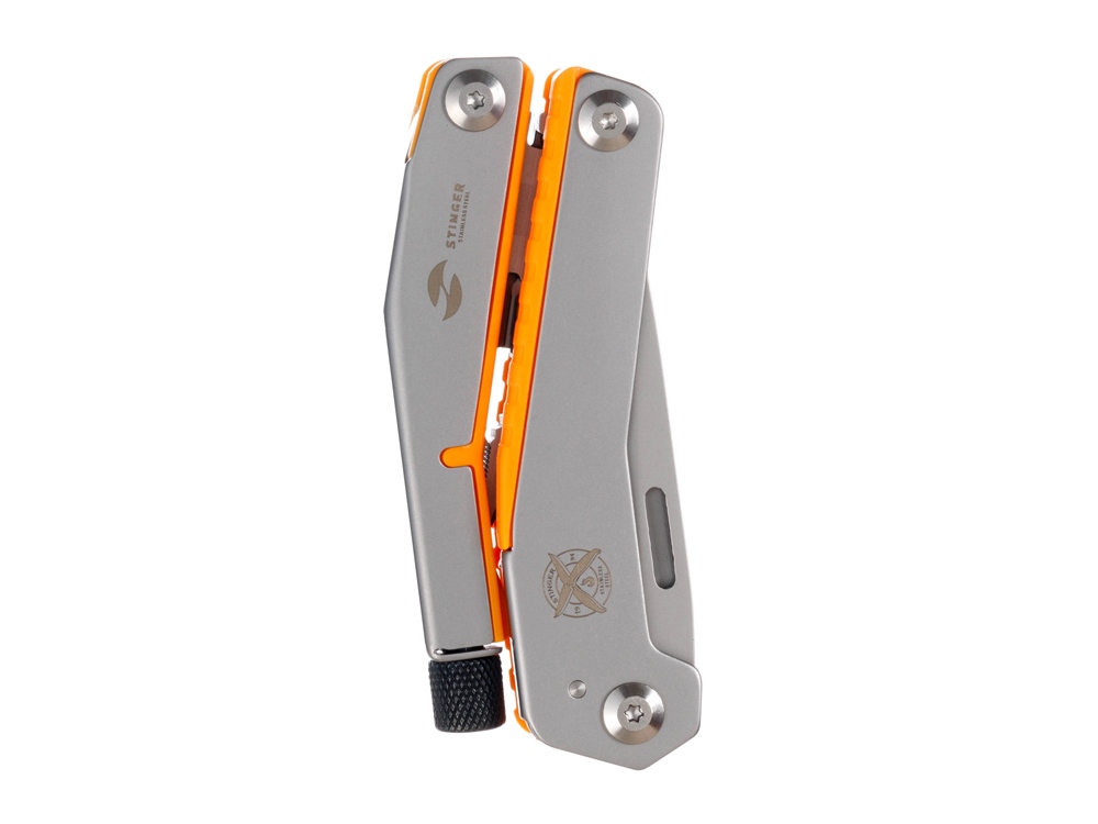 МНОГОФУНКЦИОНАЛЬНЫЙ ИНСТРУМЕНТ STINGER С НАБОРОМ ИЗ 8 ФУНКЦИЙ 1. Острогубцы 2. Плоскогубцы 3. Кусачки 4. Лезвие с фиксатором клинка Liner Lock 5. Адаптер для бит 6. Плоская отвертка 7. Крестовая отвертка 8. Клип ХАРАКТЕРИСТИКИ Материалы • лезвие/инструменты: нержавеющая сталь 440A, твердость 54-58 HRC • рукоять: нержавеющая сталь 440A, твердость 54-58 HRC • накладки рукояти: АБС-пластик Размеры • Размеры мультитула: 105х40х22 мм • Общая длина: 176 мм • Длина клинка: 71 мм • Наибольшая ширина клинка: 19,2 мм • Толщина обуха: 2 мм • Длина рукояти: 105 мм • Ширина рукояти (в ср.части): 39,8 мм • Толщина рукояти (в ср.части): 17,1 мм Вес: 184 г Цвет накладок рукояти: оранжевый Накладки рукояти мультитула не подлежат замене Комплектация: набор из 2 бит, нейлоновый чехол Упаковка: картонная коробка