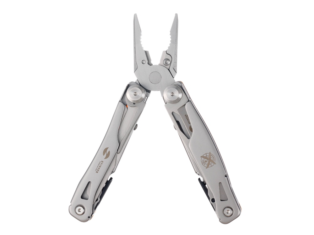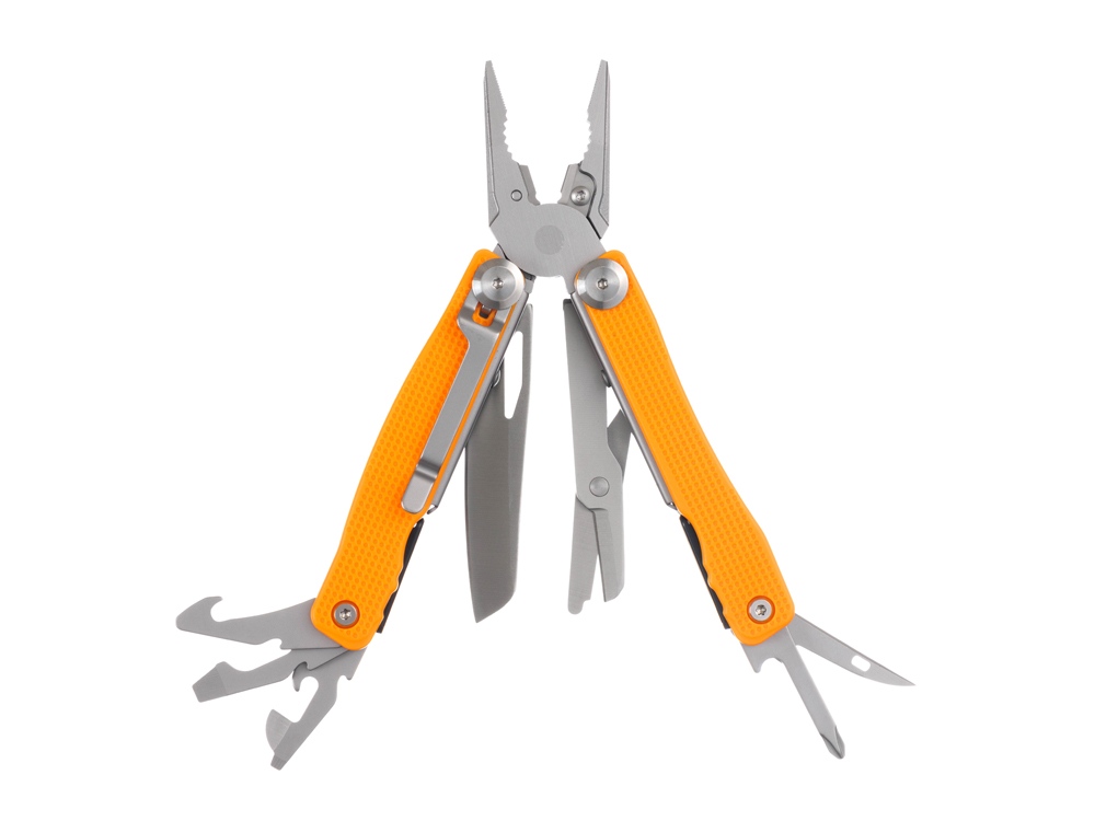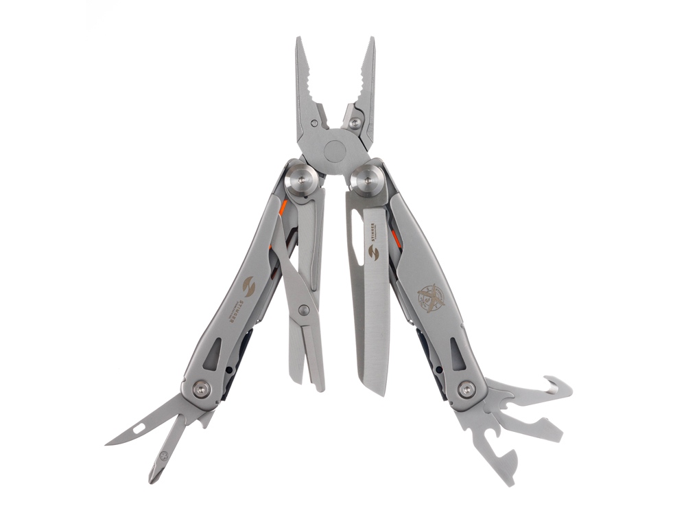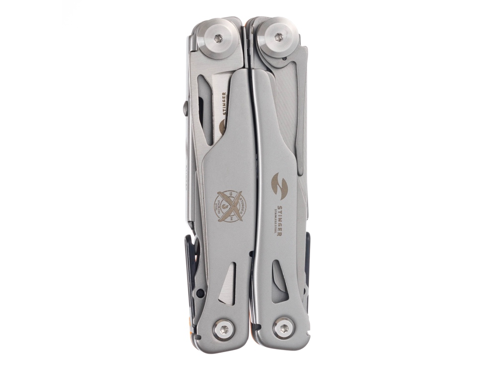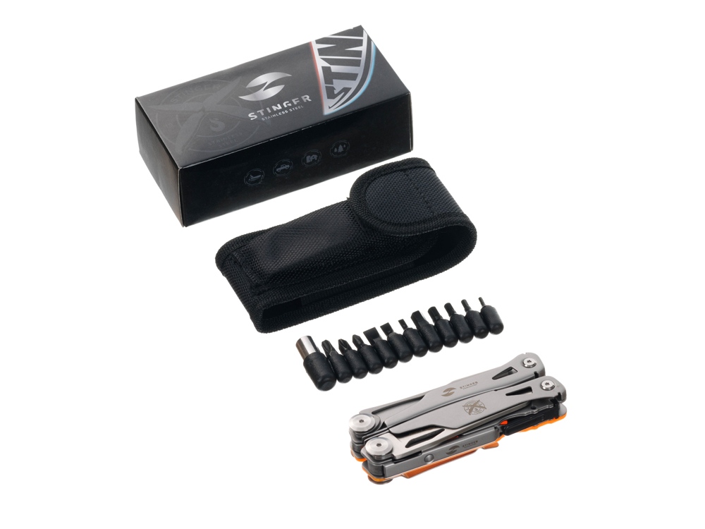 МНОГОФУНКЦИОНАЛЬНЫЙ ИНСТРУМЕНТ STINGER С НАБОРОМ ИЗ 15 ФУНКЦИЙ 1. Острогубцы 2. Плоскогубцы 3. Кусачки сменные 4. Лезвие с фиксатором клинка Liner Lock 5. Ножницы 6. Многоцелевой резак (стропорез, резак для автомобильного ремня) 7. Открывалка для бутылок с: 8. - Плоской отверткой 9. Консервный нож с: 10. - Мини-плоской отверткой 11. - Инструментом для снятия изоляции 12. Крестовая отвертка 13. Шило/кёрнер с: 14. - Иглой 15. Клип ХАРАКТЕРИСТИКИ Материалы • лезвие/инструменты: нержавеющая сталь 440A, твердость 54-58 HRC • рукоять: нержавеющая сталь 440A, твердость 54-58 HRC • накладки рукояти: АБС-пластик Размеры • Размеры мультитула: 106х38х20 мм • Общая длина: 185,6 мм • Длина клинка: 79,1 мм • Наибольшая ширина клинка: 17,1 мм • Толщина обуха: 2,5 мм • Длина рукояти: 106,5 мм • Ширина рукояти (в ср.части): 38,5 мм • Толщина рукояти (в ср.части): 18,3 мм Вес: 245 г Цвет накладок рукояти: оранжевый. Накладки рукояти мультитула не подлежат замене. Комплектация: адаптер для бит, набор из 11 бит, нейлоновый чехол Упаковка: картонная коробка