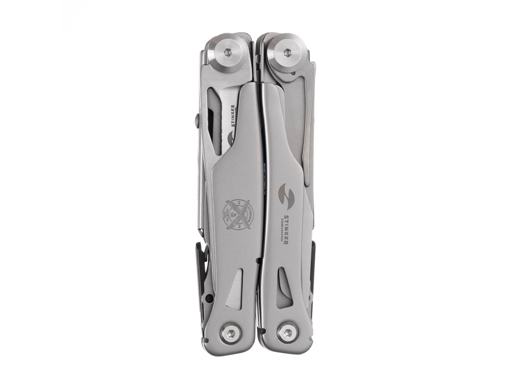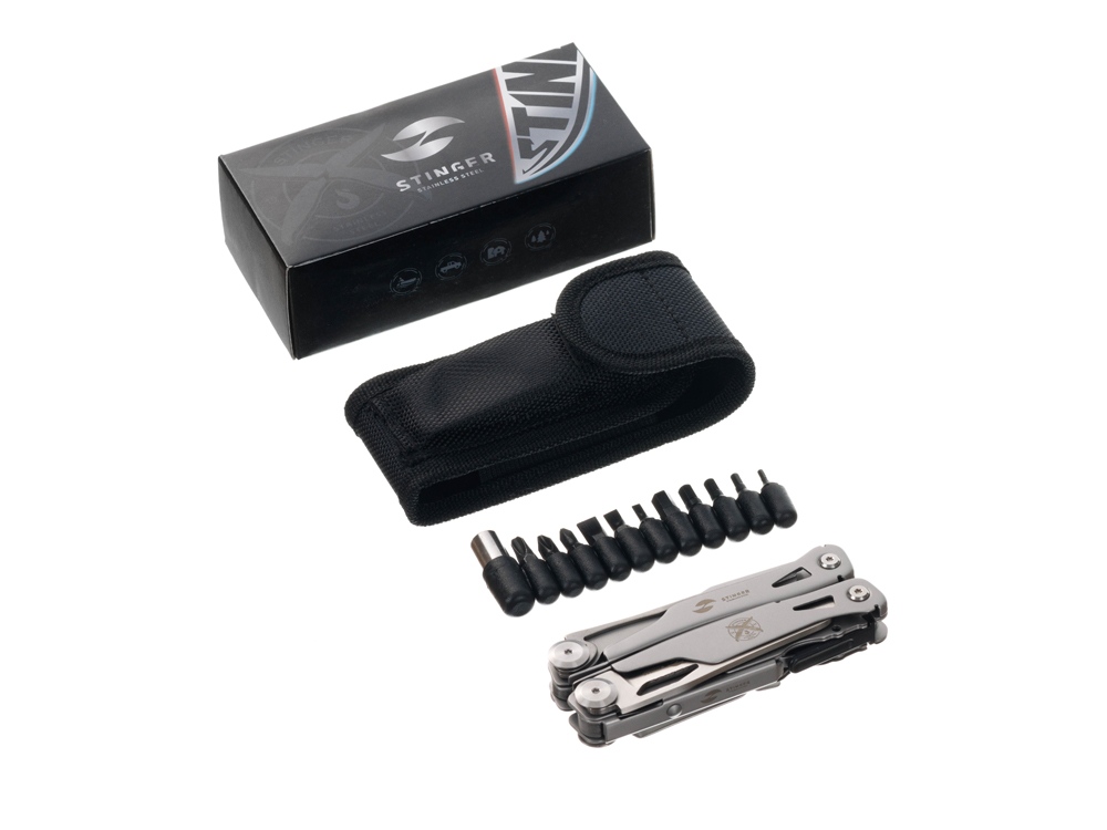 МНОГОФУНКЦИОНАЛЬНЫЙ ИНСТРУМЕНТ STINGER С НАБОРОМ ИЗ 14 ФУНКЦИЙ 1. Острогубцы 2. Плоскогубцы 3. Кусачки сменные 4. Лезвие с фиксатором клинка Liner Lock 5. Ножницы 6. Многоцелевой резак (стропорез, резак для автомобильного ремня) 7. Открывалка для бутылок с: 8. - Плоской отверткой 9. Консервный нож с: 10. - Мини-плоской отверткой 11. - Инструментом для снятия изоляции 12. Крестовая отвертка 13. Шило/кёрнер с: 14. - Иглой 15. Клип ХАРАКТЕРИСТИКИ Материалы • лезвие/инструменты: нержавеющая сталь 440A, твердость 54-58 HRC • рукоять: нержавеющая сталь 440A, твердость 54-58 HRC Размеры • Размеры мультитула: 106х38х20 мм • Общая длина: 185,2 мм • Длина клинка: 79,1 мм • Наибольшая ширина клинка: 17 мм • Толщина обуха: 2,5 мм • Длина рукояти: 106,1 мм • Ширина рукояти (в ср.части): 38,5 мм • Толщина рукояти (в ср.части): 18,1 мм Вес: 255 г Комплектация: адаптер для бит, набор из 11 бит, нейлоновый чехол Упаковка: картонная коробка