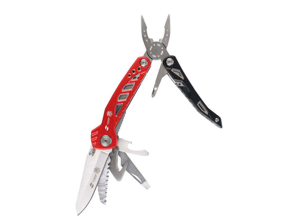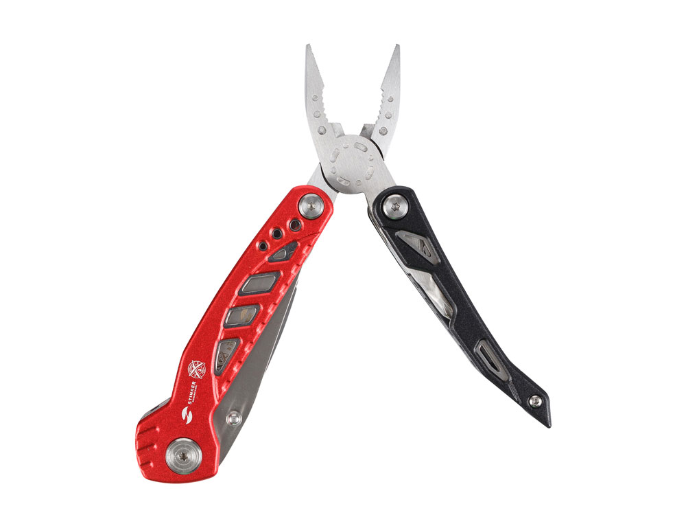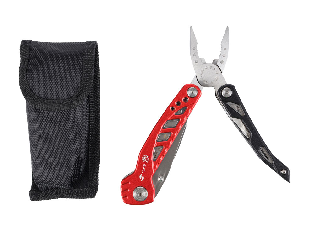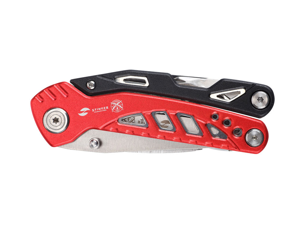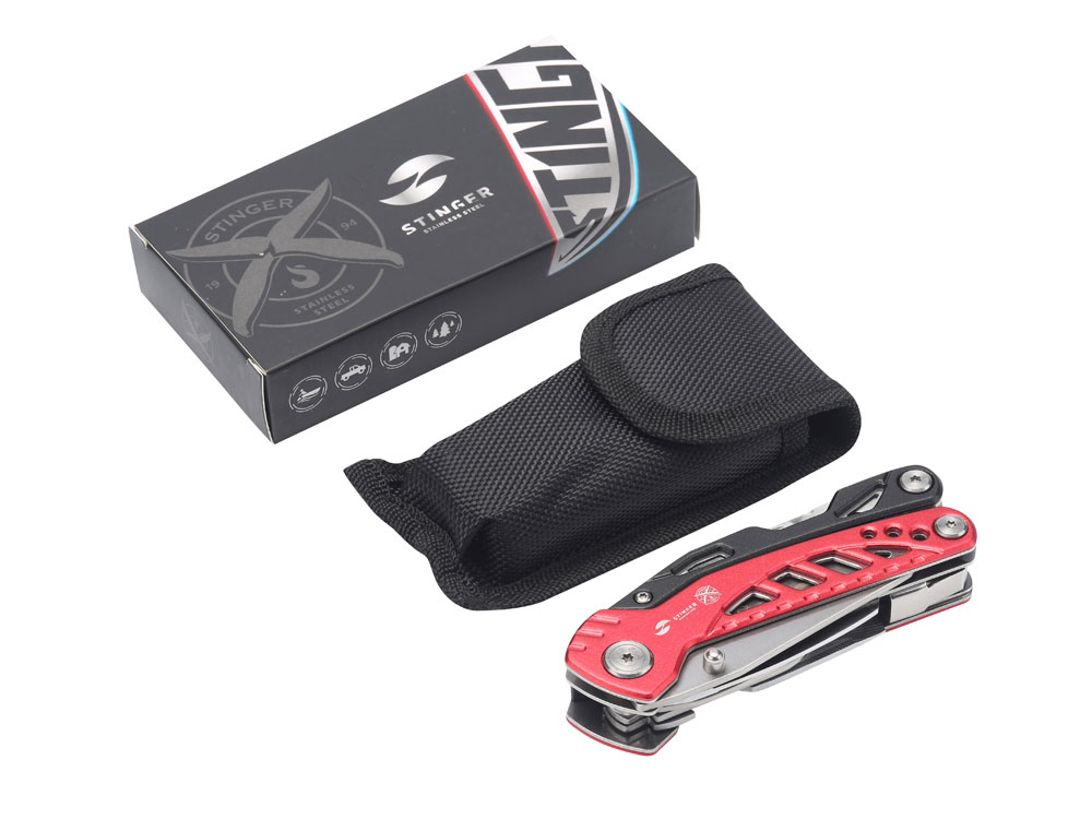 МНОГОФУНКЦИОНАЛЬНЫЙ ИНСТРУМЕНТ STINGER С НАБОРОМ ИЗ 11 ФУНКЦИЙ: 1. Острогубцы 2. Пассатижи 3. Кусачки 4. Отвертка крестовая 5. Лезвие 73 мм 6. Пила по дереву и металлу 7. Стропорез 8. Отвертка шлицевая малая 9. Отвертка шлицевая большая 10. Открывалка для бутылок 11. Напильник по дереву и металлу ХАРАКТЕРИСТИКИ: Материал инструментов: нержавеющая сталь 3Cr13 Материал рукояти: нержавеющая сталь, алюминий Длина: 107 мм Ширина: 37 мм Вес: 236 г В комплекте: чехол из синтетического материала Упаковка: складная картонная коробка