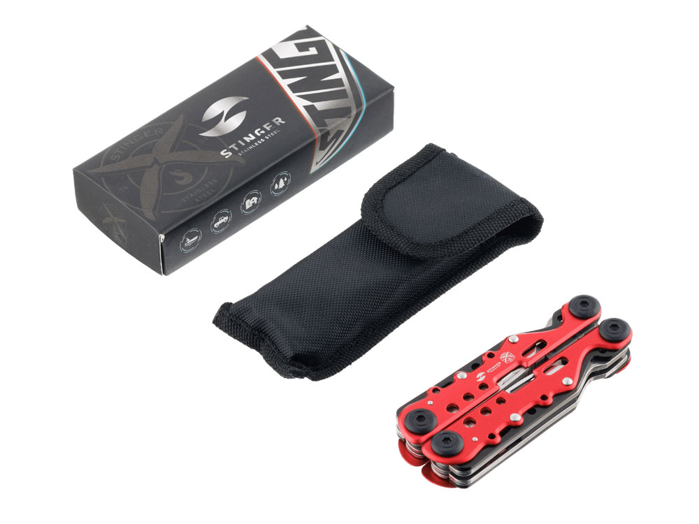 МНОГОФУНКЦИОНАЛЬНЫЙ ИНСТРУМЕНТ STINGER С НАБОРОМ ИЗ 13 ФУНКЦИЙ: 1. Острогубцы 2. Пассатижи 3. Кусачки 4. Лезвие большое плоское 5. Лезвие с серрейторной кромкой 6. Пила по дереву и металлу 7. Напильник по дереву и металлу 8. Отвёртка крестовая 9. Отвёртка шлицевая большая 10. Отвёртка шлицевая малая 11. Инструмент для снятия изоляции 12. Открывалка для бутылок 13. Консервный нож ХАРАКТЕРИСТИКИ: Материал инструментов: нержавеющая сталь 3Cr13 Материал рукояти: нержавеющая сталь Длина: 105 мм Ширина: 40 мм Вес: 230 г В комплекте: чехол из синтетического материала Упаковка: картонная коробка