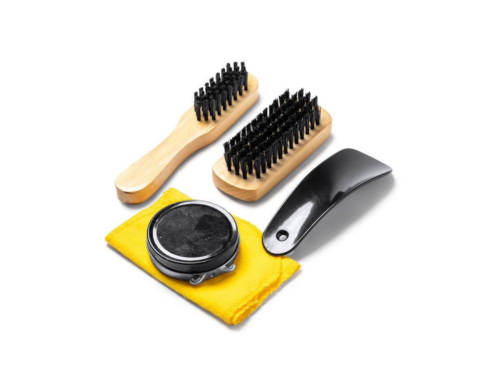 Набор для чистки обуви, включающий 5 аксессуаров: ложку для обуви, салфетку для чистки, 2 деревянные щетки и полироль нейтрального цвета. Поддерживайте обувь в чистоте где угодно. Идеально подходит для путешествий.