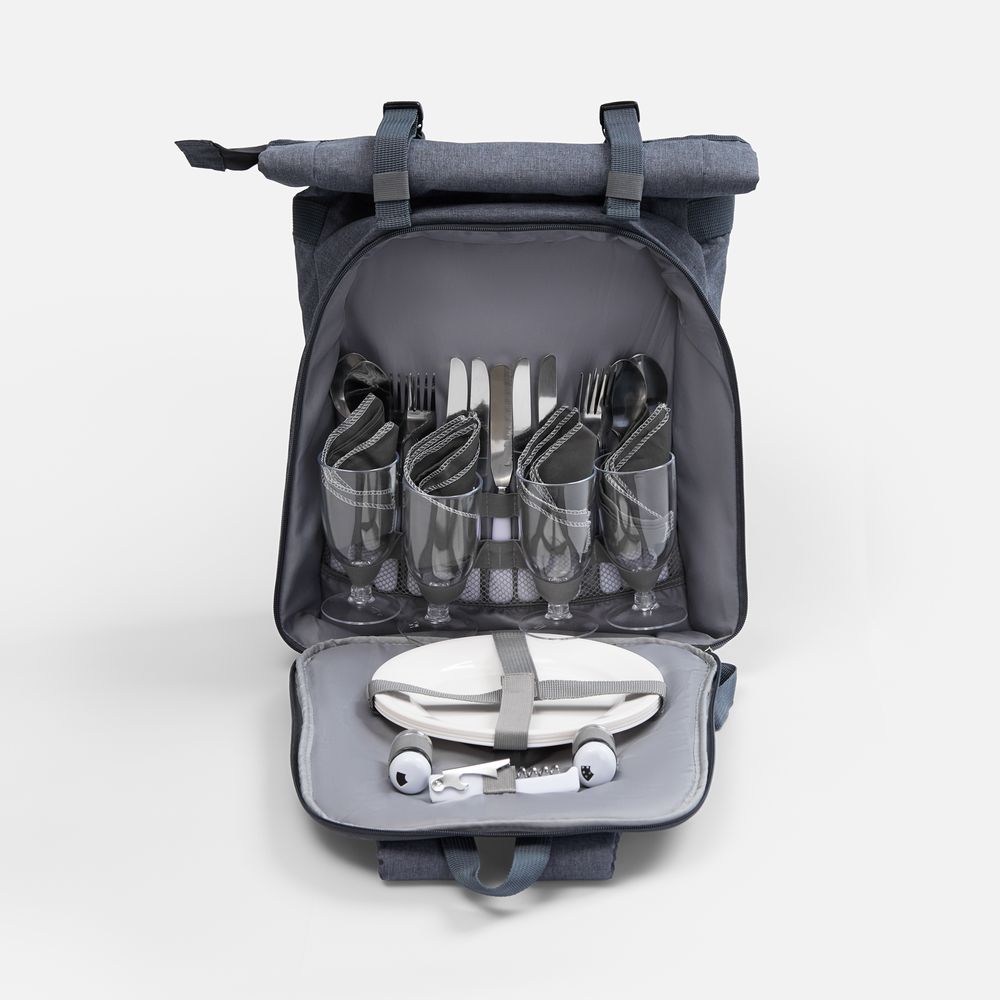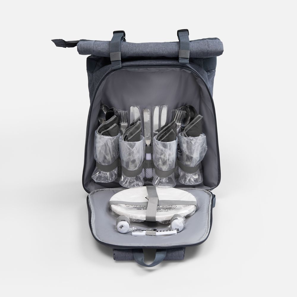 | Материал | рюкзак - переработанный полиэстер, 300D с полиуретановой пропиткой, PEVA; тарелки и бокалы - полистирол; приборы - нержавеющая сталь, пластик |
