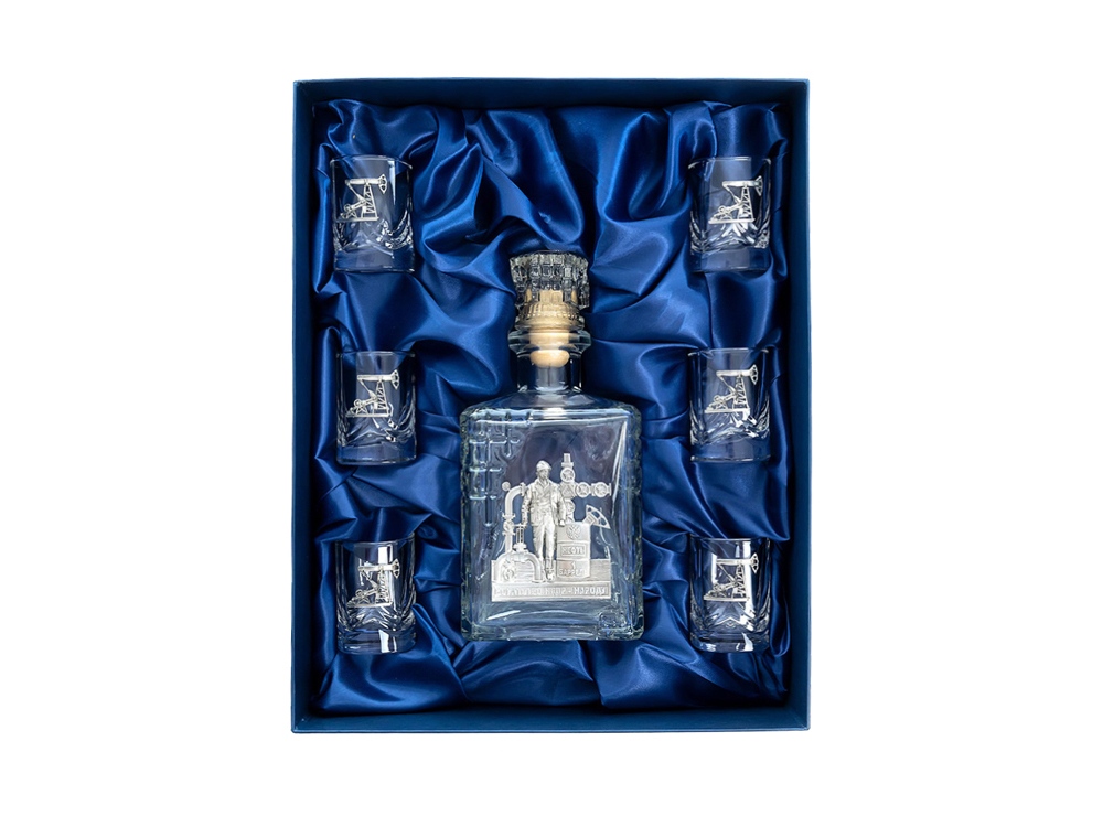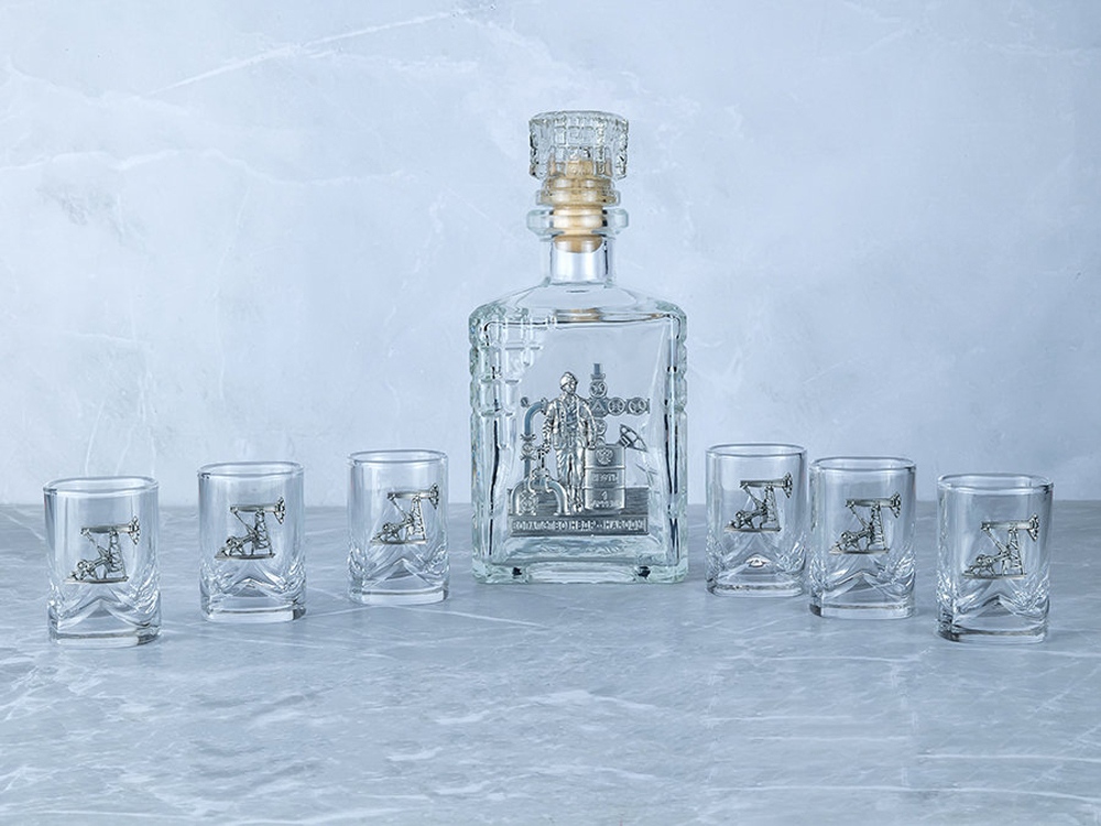 Подарочный набор со штофом Нефтяной. Традиционная для русского человека комплектация: элегантный графин емкостью 750 мл. с оловянным барельефом Нефтяник и 6 стопок емкостью 50 мл. с оловянным барельефом Нефтяная вышка. Материал барельефов: сплав с содержанием олова не менее 95%(пьютер). Художественное литье,чернение с эффектом антикварного серебра, полировка. Ручная работа. Подарочная упаковка люкс с атласным ложементом.