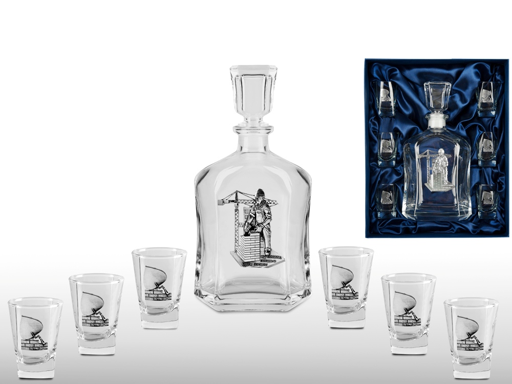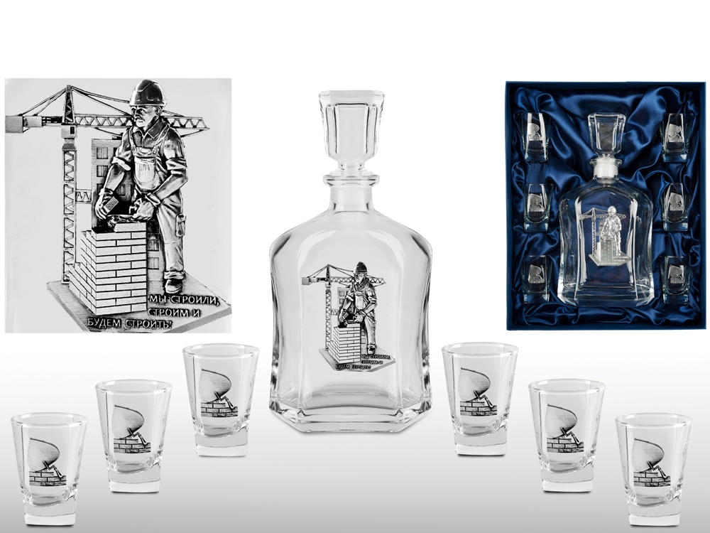 Подарочный набор со штофом СТРОИТЕЛЬ. Традиционная для русского человека комплектация: элегантный графин емкостью 700 мл. с оловянным барельефом СТРОИТЕЛЬ и 6 стопок емкостью 50 мл. с оловянным барельефом Мастерок. Материал барельефов: сплав с содержанием олова не менее 95%(пьютер). Художественное литье,чернение с эффектом антикварного серебра,полировка. Ручная работа. Подарочная упаковка люкс с атласным ложементом синего цвета.