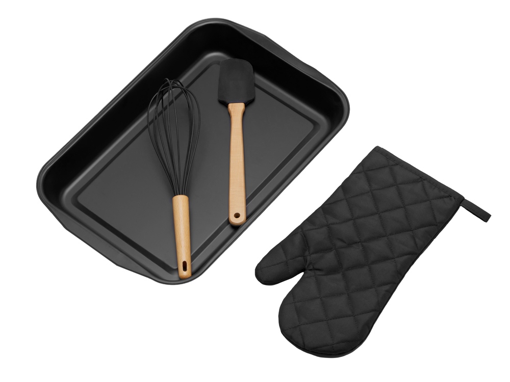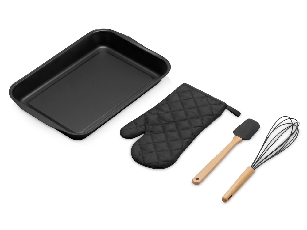 Кондитерский кухонный набор Biscotti незаменим на кухне любого кулинара. Большая форма для запекания отлично подойдёт для любых запеканок и пирогов, - их точно хватит на большую семью! Венчик и лопатка изготовлены из букового дерева - очень прочной и долговечной древесины, и пищевого силикона, который не впитывает жир, не царапает поверхности, а также легко моется! Приборы удобно ложатся в ладонь, обеспечивая комфорт при приготовлении. Варежка с одной стороны имеет гладкую поверхность, которая позволяет брендировать её термотрансфером. - полезный мерч; - высокое качество материалов; - большой размер формы для запекания: 41x27,5x4,2 см.