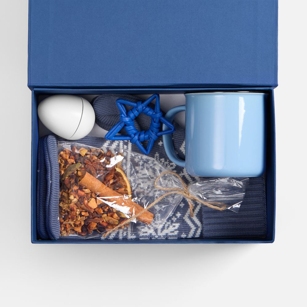 Материал варежки - акрил 100%; футляр для бальзама - пластик; кружка - фаянс; плетеная фигурка - бумага; коробка - переплетный картон, бумага Malmero «Скандинавский синий»