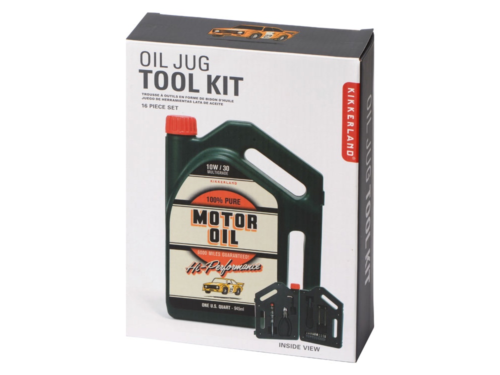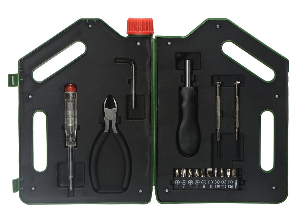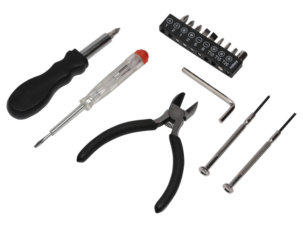 Набор инструментов в футляре в виде канистры включает в себя 1 тестер напряжения, 1 пару плоскогубцев, 1 шестигранный ключ, 1 рукоятку, к которой можно крепить отвертки, 2 прецизионные отвертки, 1 крестообразную головку, 1 плоскую головку, 10 бит.