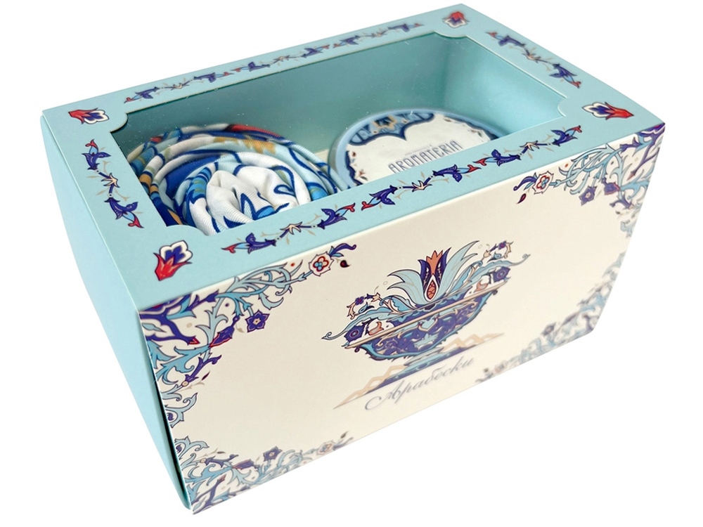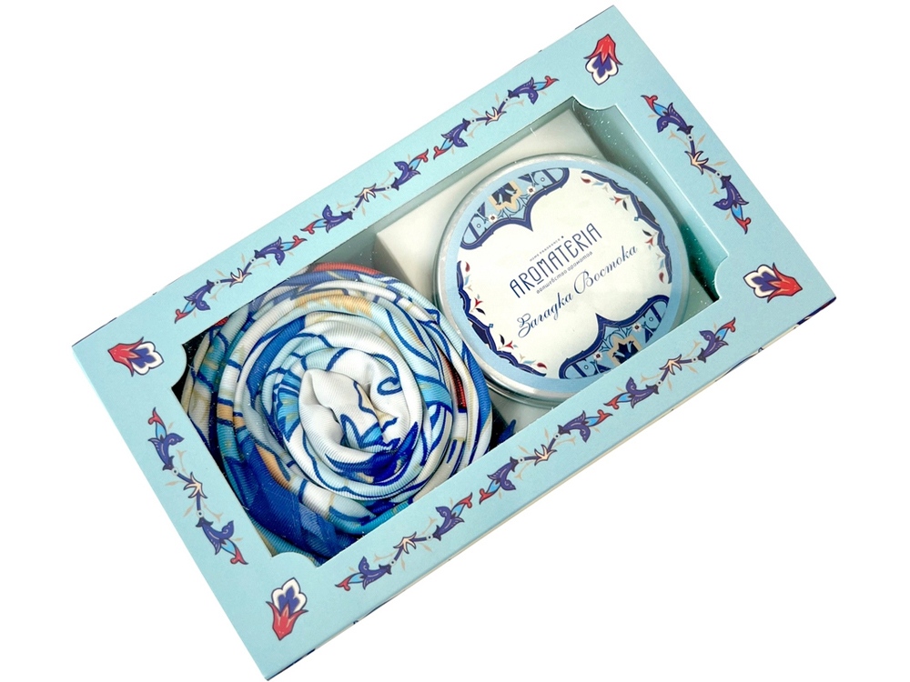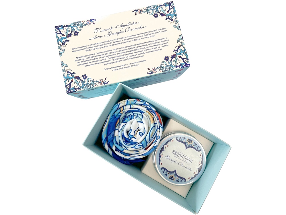 Загадочный Восток – это роскошь тканей, запах пряностей, красота экзотических цветов. Легкое прикосновение шелка платка Арабески по ориентальным мотивам подарит частицу восточной магии. Растительно-геометрический орнамент и уточненная цветовая гамма навеют чарующие образы и сладкие грезы. Ароматическая свеча Загадка Востока наполнит пространство терпкими нотами грейпфрута и мускуса, раскрываясь многогранными аккордами ванили и бобов тонка. Дуэт создаст чувственное настроение для незабываемых мгновений праздника! Платок: 70% искусственный шёлк, 30% вискоза, 90х 90 см Свеча: натуральный соевый воск, парфюмерная композиция (объем 100мл/ 20 часов горения)