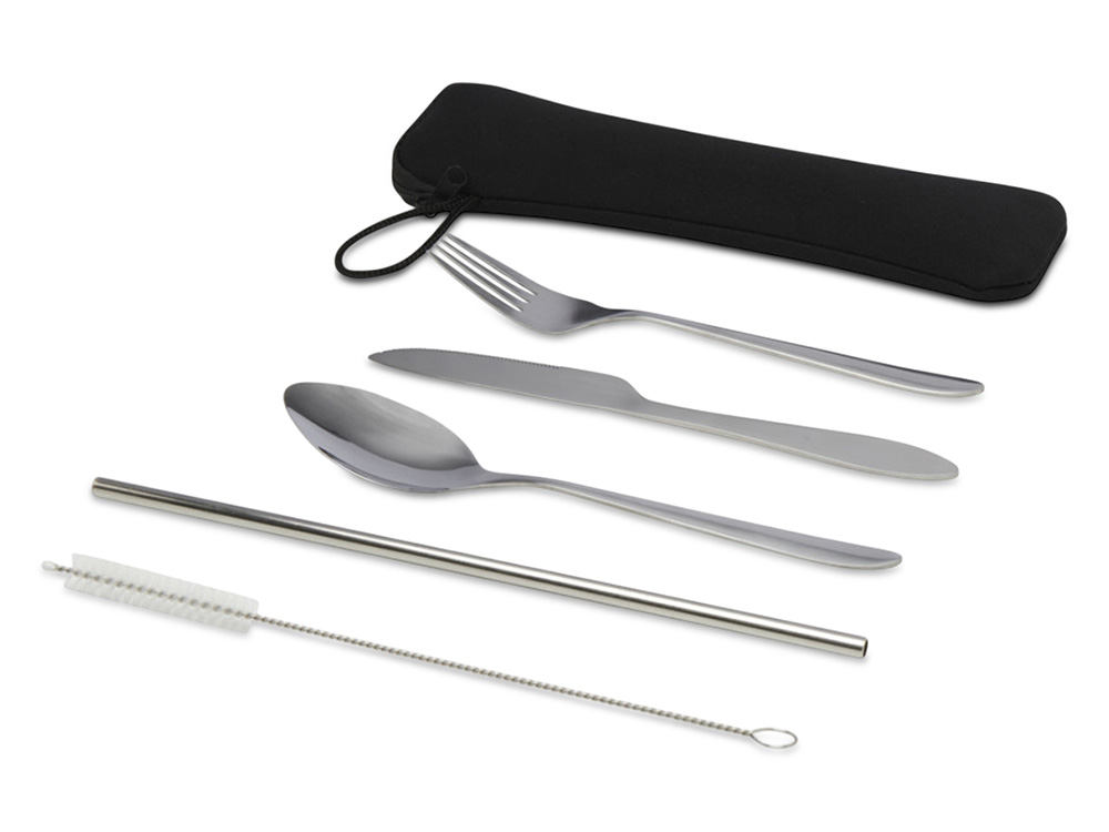 Набор столовых приборов Sheen включает вилку, нож, ложку, многоразовую соломинку и щёточку для её очистки. Все элементы выполнены из прочной и легко моющейся нержавеющей стали. Комплект удобно хранить и переносить в прочном чехле из неопрена с удобной петлей.