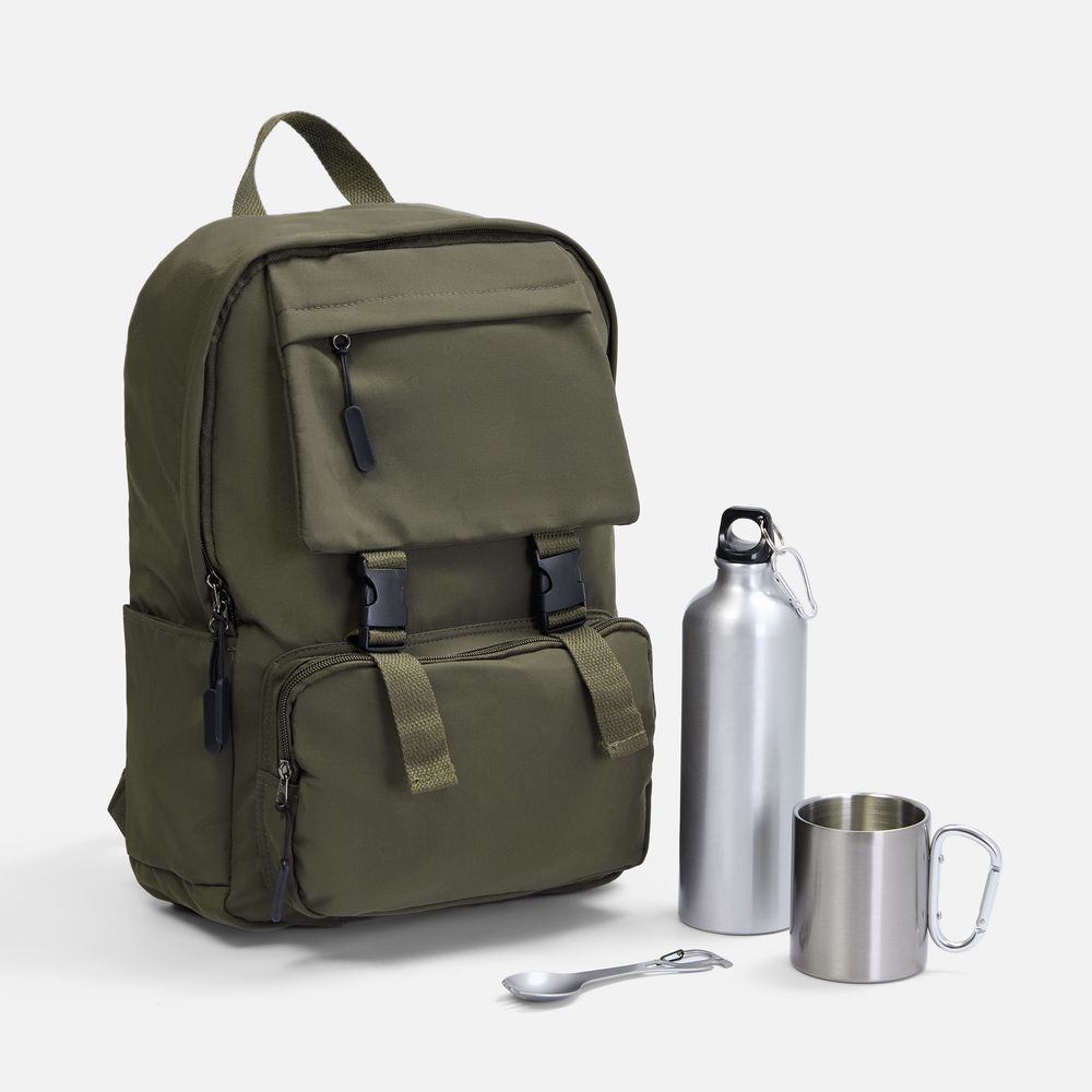 | Материал | рюкзак - нейлон; кружка - пищевая сталь, 304, внутри - нержавеющая сталь, 201; бутылка - алюминий; столовый прибор - нержавеющая сталь, 420 |